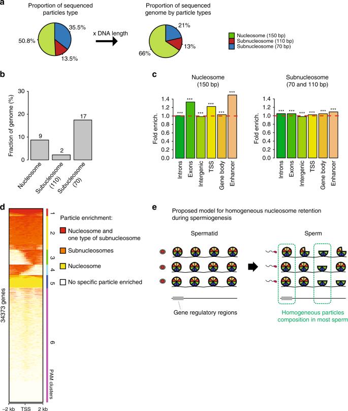 a Relative abundance (left) and genome coverage (right) of nucleosomes and subnucleosomes in the sperm chromatin. The left pie chart reports the fraction of DNA fragments from Xenopus Laevis sperm corresponding to each type of particle; the right pie chart reports the fraction of genome covered by each type of particle. b Fraction of the genome with homogeneous particles composition. The bar graph indicates the percentage of the genome that possess nucleosomal or subnucleosomal structure across most sperm of the population sequenced (genome binned in 50 bp windows). c Fold enrichment (observed/random) over 1000 randomisations for homogeneous nucleosomes (left) or subnucleosomes (right) composition at the indicated genomic features; ***: empirical p value < 1eâ3. Input data from two independent replicates were pooled. d PAM (partitioning around medoids) clustering of promoter (TSS +/â2âkb) according to enrichment for nucleosomes or subnucleosomes. e Model of nucleosomes and subnucleosomes distribution in sperm and spermatid. Source data related to a, b and d are provided as Source Data files.