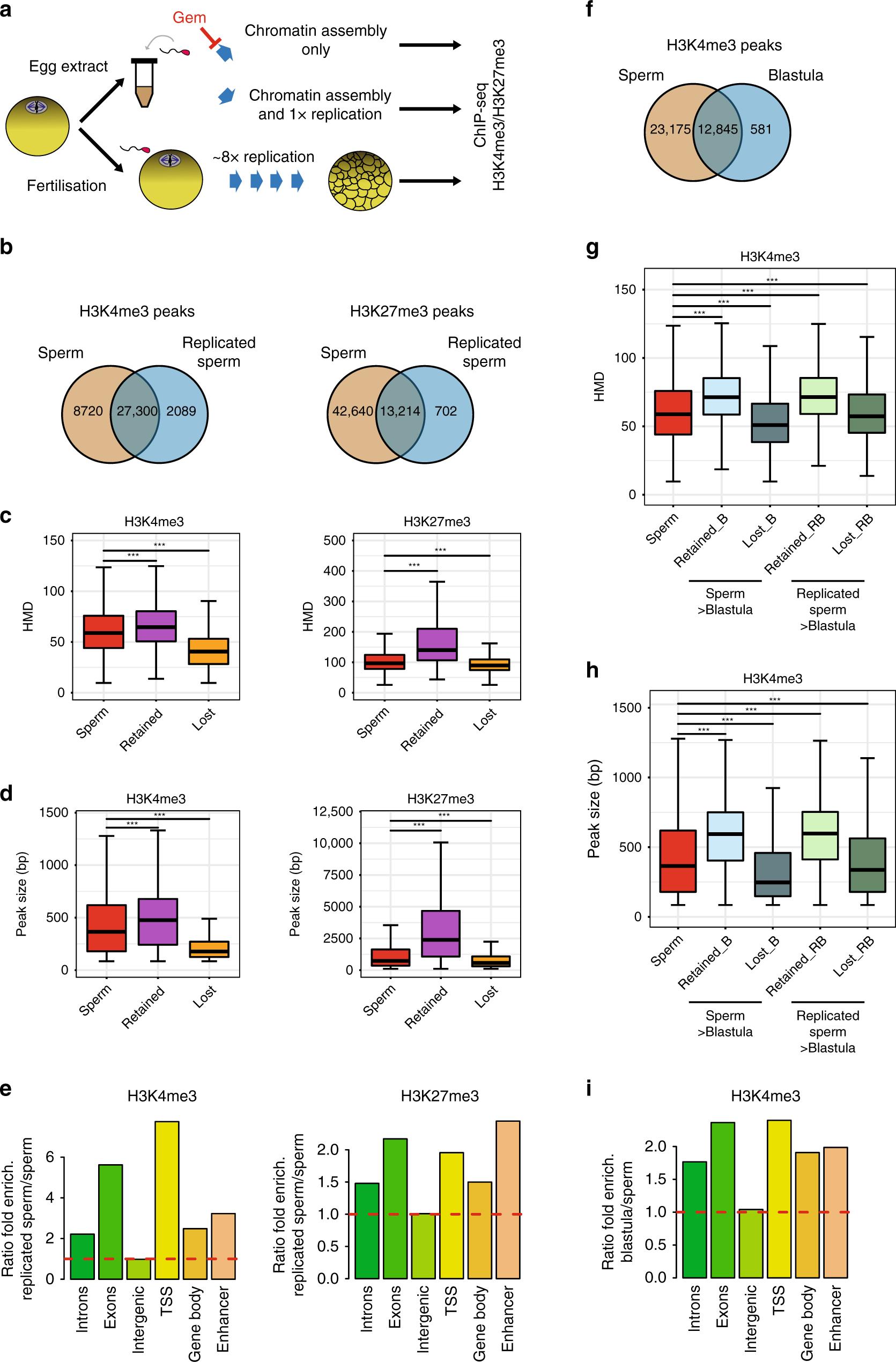 a Experimental setup to monitor the fate of sperm-methylated histone peaks after replication. b Overlap between peaks of H3K4me3 and H3K27me3 before and after replication of sperm chromatin in egg extract. c Boxplots of HMD for all sperm peaks and for peaks that are lost or retained after replication. d Boxplots of the size of all sperm peaks, and of peaks that are lost or retained after replication. Data in c and d are obtained from N. sperm peaks H3K4me3: 36020; N. sperm retained H3K4me3: 27300; N sperm lost H3K4me3: 8715. N. sperm peaks H3K27me3: 55854; N. sperm retained H3K27me3: 13214; N sperm lost H3K27me3: 42635. ***p valueâ<â1eâ3 (two-sample KolmogorovâSmirnov test). e Ratio of fold enrichment of peaks retained after replication over those lost after replication at indicated genomic features. Fold enrichments (observed/random) were obtained from 1000 randomisations and all instances showed an empirical p valueâ<â1eâ3. f Overlap between peaks of H3K4me3 in sperm and in blastula embryos. g Boxplots indicating HMD for all sperm peaks and for peaks that are lost or retained in blastula compared with sperm, and lost or retained in blastula compared with replicated sperm. h Boxplots of peak sizes for all sperm peaks and for peaks lost and retained in blastula compared with sperm, and in blastula compared with replicated sperm. In g and h ***p valueâ<â1eâ3 and are obtained by the two-sample KolmogorovâSmirnov test. i Ratio of fold enrichment of peaks retained in blastula versus those in sperm at indicated genomic features. This ratio has been obtained as in e. HMD is from data pooled from two independent replicates. Peaks retention/lost are consensus from three independent replicates.
