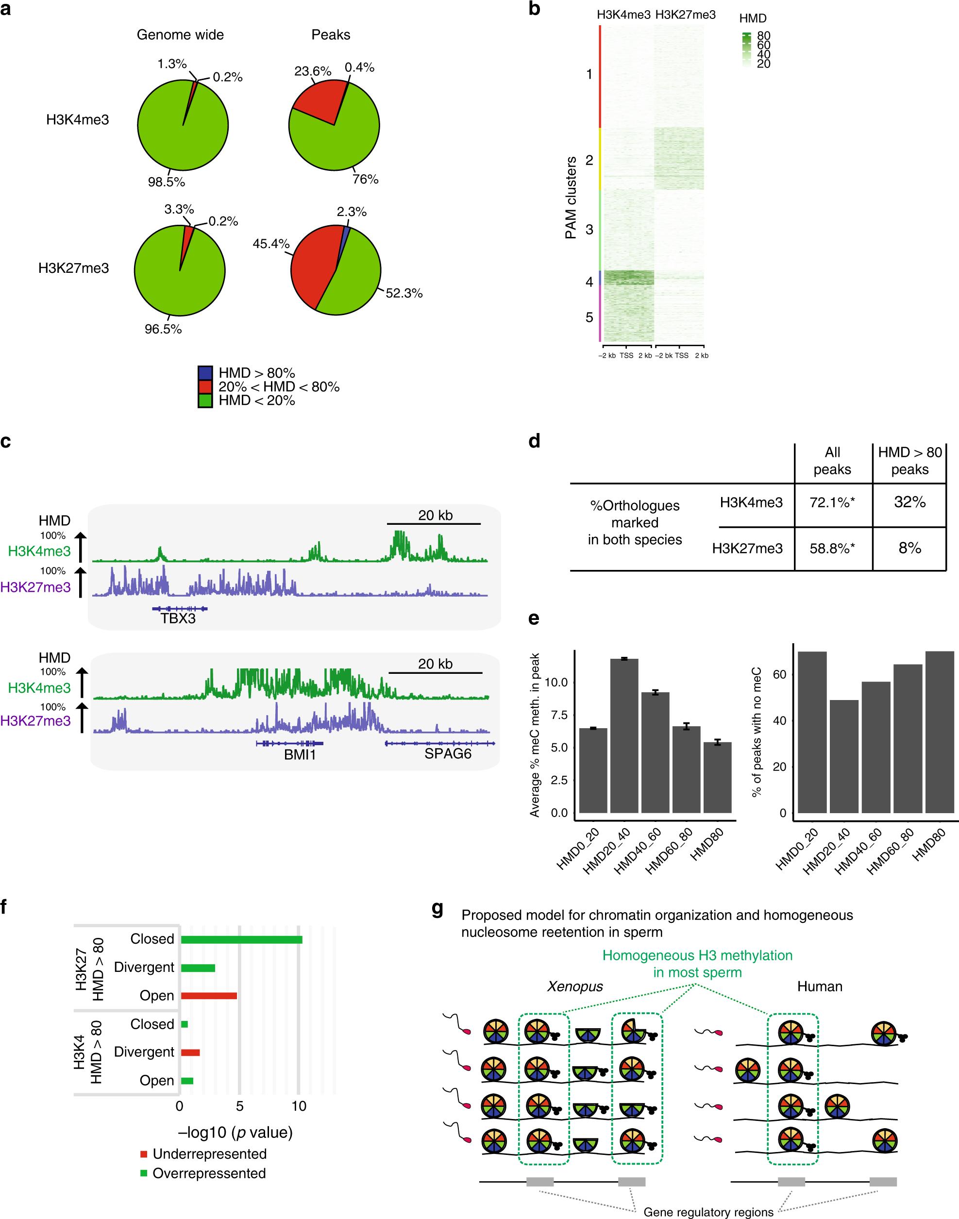 a Percentage of the genome (left) and percentage of peaks (right) with different levels of H3K4 or H3K27 methylation density in human sperm. b PAM clustering of H3K4 and H3K27 HMD levels at promoter regions (TSS +/â2âkb) in human sperm. c Genome browser screenshots of TBX3 and BMI1 HMDs in human sperm. d Percentage of gene orthologues with peaks of histone methylation in both human and Xenopus sperm. e Barplots of the average percentage (%) of 5mC methylation at H3K27me3 peaks stratified by methylation level (left); error bars: sem; barplot of the percentage of H3K27me3 peaks showing absence of 5mC methylation (right) (5mC methylation: single-sperm bisulfite sequencing data from ref. 31). f Barplots indicating âlog10 (p value) for enrichment of sperm TSSs with HMDâ>â80 for H3K4 or H3K27 in set of genes with TSSs showing different chromatin accessibility level in eight cell embryos (open and closed corresponds to TSSs open or closed in all cells of a eight cell embryos), whereas divergent corresponds to TSSs either open or closed in different cells (ATAC-seq data from ref. 31); p values determined by Ï2 proportion test evaluating if the proportion of gene of interest is higher (green) or lower (red) than the genome-wide proportion (i.e., expected proportion). g Model of epigenetic homogeneity in Xenopus and human sperm. The cartoon summarises the observed trends in retention of modified histones across the genome in those species. Source data related to b and e are provided as Source Data files.