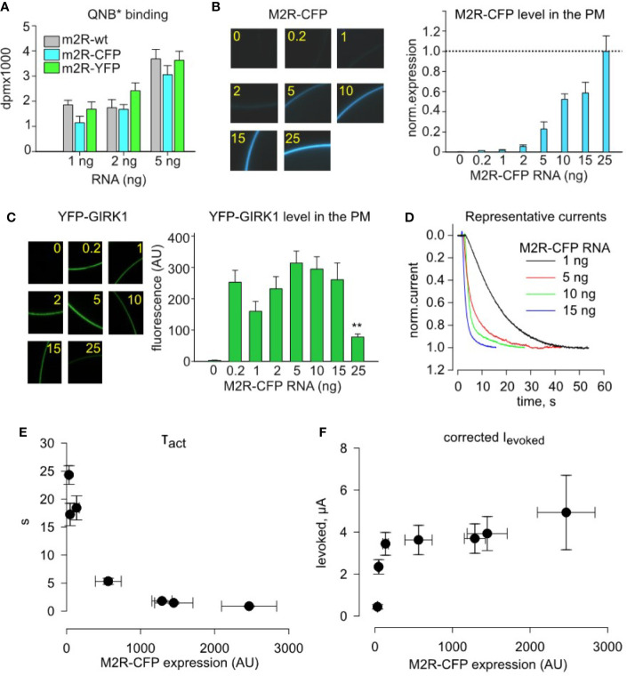 Figure 3. Quantitative analysis of dose-dependency of Ïact and amplitude of Ievoked on plasma membrane density of M2R-CFP. (A)-Whole cell radioligand-labeling by quinuclidinyl benzilate (QNB*) shows that identical doses of injected RNA produce similar surface expression of M2R, M2R-CFP and M2R-YFP, for three different amounts of receptor RNAs. B-F, quantitative analysis of incremental expression of M2R-CFP reveals collision-coupling activation of YFP-GIRK1/GIRK2 channels. Oocytes were injected with constant mRNA amounts of YFP-GIRK1 and GIRK2 (1 ng each) but with increasing doses of M2R-CFP RNA. (B) â RNA dose-dependent increase in the surface levels of M2R-CFP. Representative micrographs of oocytes (left) expressing m2R-CFP and summary of expression (right). RNA amounts of M2R-CFP RNA, in ng/oocyte, are indicated in yellow. n=7-12 oocytes in each group. (C) â expression of M2R-CFP does not affect the surface level of YFP-GIRK1/GIRK2 except for the decrease at the highest dose of M2R-CFP, 25 ng/oocyte (**, p<0.01). Left panel shows representative micrographs of YFP-GIRK1/GIRK2 â expressing oocytes. Numbers within the images indicate the amounts of M2R-CFP RNA, in ng/oocyte. Right panel shows summary of expression data (n=7-12 oocytes in each group). (D) â representative normalized Ievoked, elicited by 10 µM ACh in oocytes injected with the indicated amounts of M2R-CFP RNA. For simplicity, only the initial (activation) phase of Ievoked is shown. (E, F) â Ïact is reduced (E) and Ievoked amplitude (F) is increased with increased surface density of M2R-CFP. AU, arbitrary units. Ïact and Ievoked data are from cells exemplified in B â D; n=5-12 in each group. |
