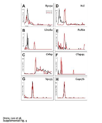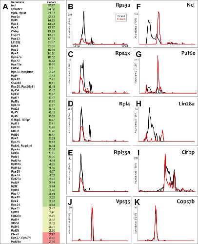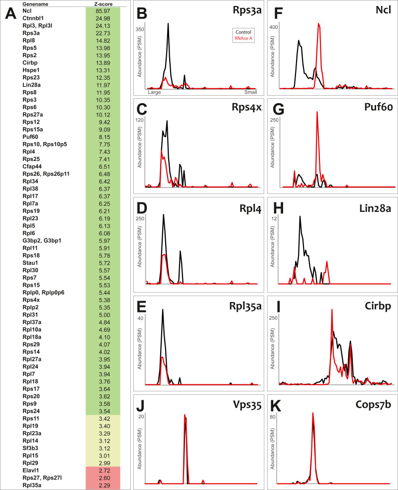 Fig. 2. Individual DIF-FRAC elution profiles show distinct changes consistent with RNAse sensitivity. (A) Table of DIF-FRAC calculated Z-scores for ribosomal proteins and selected others. Values highlighted in green and yellow are considered high confidence. Values in red are of borderline confidence and should be evaluated with prior knowledge. (B–D) Individual profiles for ribosomal subunits. X-axis represents SEC fractions from larger molecular weight to smaller. Y-axis represents observed abundance in MS by unique peptide spectral matches normalized to the highest value for that protein. (E) Ribosomal subunit, Rpl35a, had a Z-score below the cutoff (A), but its elution profile shows consistent behavior with other ribosomal subunits. (F) Known RNA-binding protein, Nucleolin, shows shift in molecular weight. (G) Known RNA-binding protein, Puf60, shows increased observed abundance. (H–I) Profiles of RNA-binding proteins with known roles in Xenopus development. (J–K) Elution profiles of negative controls do not change.