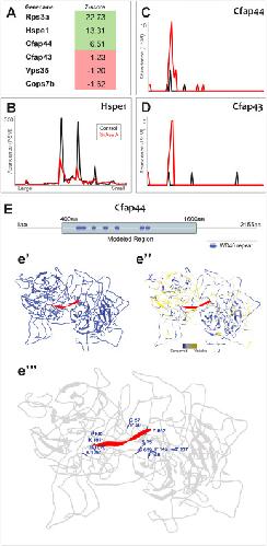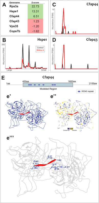 Fig. 3. DIF-FRAC identifies a ciliopathy protein as RNA associated. (A) Table of DIF-FRAC calculated Z-scores for selected motile cilia-related proteins; Rps3A, Vps35 and Cops7b serve as positive and negative controls. (B) Elution profile of Hspe1 shows loss of observed abundance. (C) Elution profile of the inner arm dynein tethering protein Cfap44 shows a gain of observed abundance. (D) Elution profile of Cfap43 shows similar behavior to Cfap44. (E) Graphic of modeled region of Cfap44 showing identified WD40 repeat segments. (e’) Homology model of Cfap44 WD-40 domains (blue) with an RNA molecule (red) is modeled from Gemin5 crystal structure (PDB ID: 5GXH). (e’’) Homology model of Cfap44 colored to show amino acid conservation where blue is highly conserved and yellow is variable. (e’’’) Homology model of Cfap44 highlighting highly conserved residues in proximity (<5.0 Å) to modeled RNA molecule.