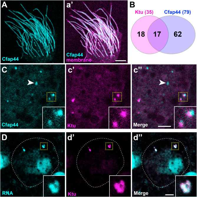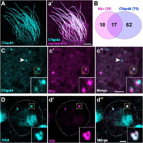 Fig. 4. Cfap44 and RNA are present in DynAPs: (A, a’) GFP-Cfap44 localizes to axonemes in Xenopus motile cilia, as indicated by co-labelling with the membrane-RFP. (B) Overlap of Cfapp+ and Ktu + cytosolic foci in MCCs. (C, c’, c’’) GFP-Cfap44 labels cytosolic foci, some of which partially co-localize with DynAPs as indicated by co-labelling with mCherry-Ktu. This partial co-localization in DynAPs is reminiscent of that observed for inner or outer arm dynein subunits (Lee et al., 2020). (D, d’, d’’) Staining with SYTO RNASelect highlights RNA in the nucleus and also in DynAPs, as indicated by co-labelling with mCherry-Ktu.