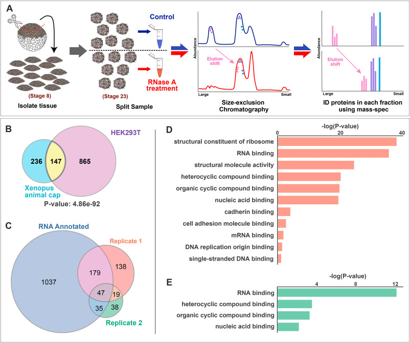 Fig. 1. Differential Fractionation (DIF-FRAC) identifies RNA-associated proteins in a mucociliary epithelium. (A) Experimental workflow of the RNAse DIF-FRAC experiment on Xenopus animal cap explants. (B) Venn diagram displaying overlap of RNA-associated proteins in Xenopus animal caps with previously published data from HEK293T cells (Mallam et al., 2019). The p-value represents the probability of overlap based on chance using the hypergeometric test. (C) Venn diagram of high confidence hits identified in replicate experiments and previously annotated RNA associated proteins. The set of previously annotated RNA associated proteins was constructed by including those with >10 peptide spectral matches in either of the replicates. (D–E) Gene ontology molecular function enrichment analysis of high confidence DIF-FRAC hits from replicate 1 (D) and replicate 2 (E).