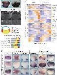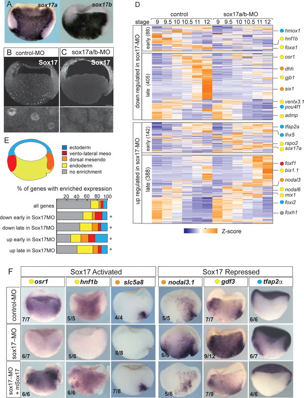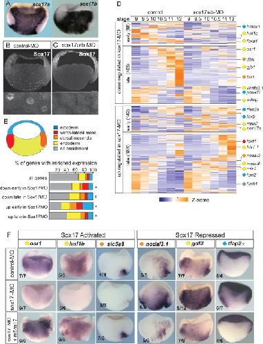 Figure 1. Sox17-regulated endoderm transcriptome. (A) Endoderm expression of sox17a and sox17b in NF10.5 Xenopus tropicalis gastrula. (BâC) Sox17 immunostaining in control-MO (B) and sox17a/b-MO (C) injected gastrula with an antibody that recognizes both Sox17a and Sox17b shows MO effective knockdown. (D) Time course heatmap of Sox17-regulated transcripts. Differentially expressed genes from a pairwise comparison of control-MO and sox17-MO (>2 fold change, FDR < 5%) at each stage showing transcripts that are downregulated or upregulated early (NF9-10) or late (NF10.5â12). Key genes are color coded based on regional expression from fate map in (E). (E) Enriched expression of Sox17-regulated transcripts. Gastrula fate map (dorsal right) colored by different tissues. Stacked bar graphs showing different patterns of enriched spatial expression based on RNA-seq of dissected gastrula tissues (Blitz et al., 2017). Distribution of expression patterns statistically different from all genes in the genome was determined by two-sided Kolmogorov-Smirnov tests *p<0.01. (F) In situ validation of Sox17-regulated transcripts. Disrupted expression in sox17-MOs is rescued by co-injection of mouse (m) Sox17 RNA. |