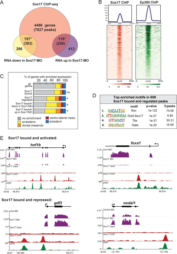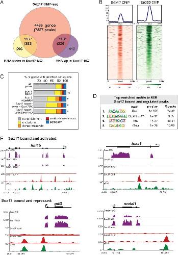 Figure 2. ChIP-seq identifies Sox17-bound enhancers and direct transcriptional targets. Sox17 ChIP-seq of gastrula embryos. (A) Venn diagram of Sox17-bound genes (and associated peaks) from ChIP-seq intersected with Sox17-regulated genes. Gene intersections are statistically significant based on hypergeometric tests* p<0.001. (B) Peak density plots showing that the Sox17-bound loci are cobound by the histone acetyltransferase Ep300, a marker of active enhancers. Average density of all peaks in top panel. (C) Sox17-bound genes are enriched in the endoderm. Stacked bar graphs showing different patterns of enriched spatial expression based on RNA-seq of dissected gastrula tissues (Blitz et al., 2017). Distribution of expression patterns statistically different from all genes in the genome was determined by two-sided KolmogorovSmirnov tests *p<0.01. (D) Top enriched DNA-binding motifs in Sox17 peaks, based on HOMER hypergeometric test. (E) Genome browser views of representative genes showing RNA-seq expression in control-MO and sox17-MO embryos and ChIPseq tracks of Sox17 and Ep300 binding. |