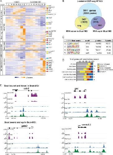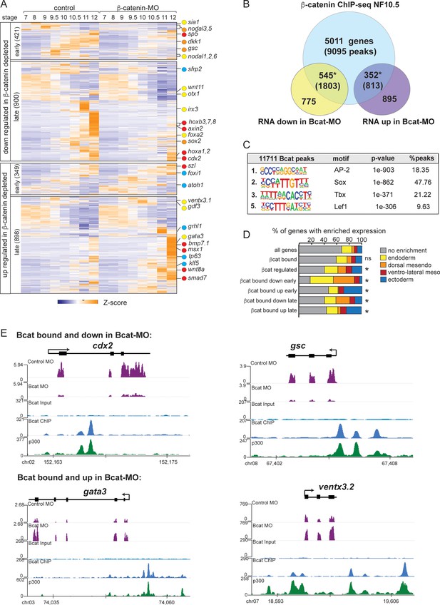 Figure 3. The Bcat-regulated genomic program. (A) Time course heatmap of Bcat-regulated transcripts. Differential expressed genes from a pairwise comparison of control-MO and Bcat-MO embryos (>2 FC, FDR < 5%) at each stage identified 2568 Bcat-regulated transcripts; 1321 downregulated and 1247 upregulated in Bcat-MO embryos. Key genes are color coded based on regional expression from (D). (B) Venn diagram intersecting Bcat-regulated genes with Bcat-bound genes (and associated peaks) from published X. tropicalis gastrula Bcat ChIP-seq data (Nakamura et al., 2016) identified 898 putative direct targets associated with 2616 peaks. Statistically significant intersections based on hypergeometric tests* p<0.001.* (C) Motif enrichment analysis of Bcat peaks by HOMER hypergeometric test. (D) Stacked bar graphs showing different patterns of enriched spatial expression based on RNA-seq of dissected gastrula tissues (Blitz et al., 2017). Distribution of expression patterns statistically different from all genes in the genome was determined by twosided Kolmogorov-Smirnov tests *p<0.01. (E) Genome browser views of representative genes showing the RNA-seq expression in control-MO and Bcat-MO embryos and Bcat and Ep300 ChIPseq tracks. |