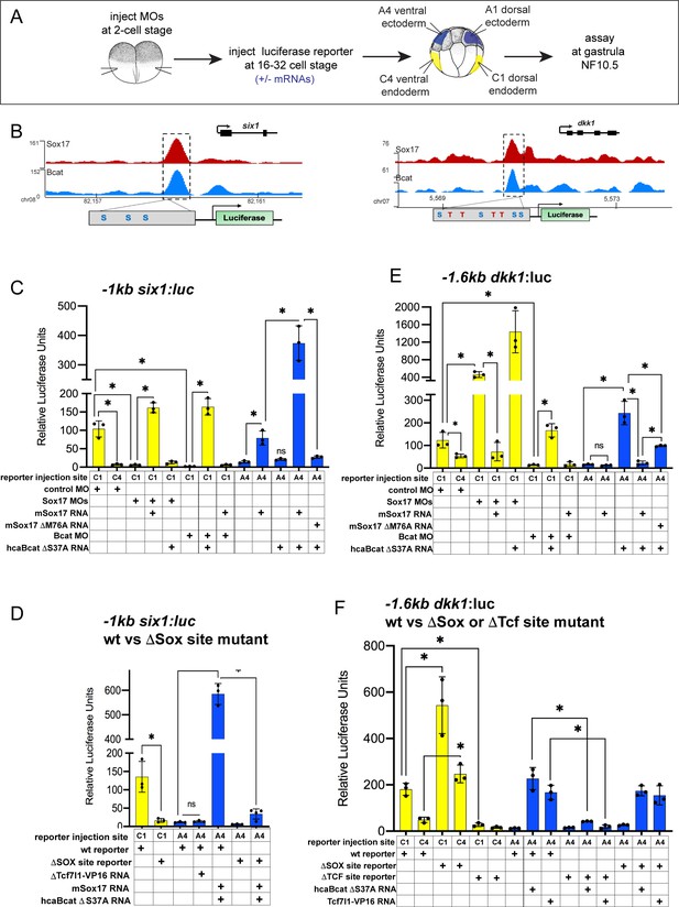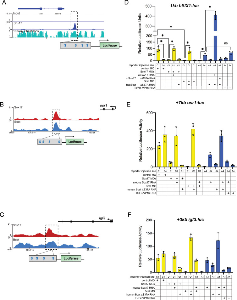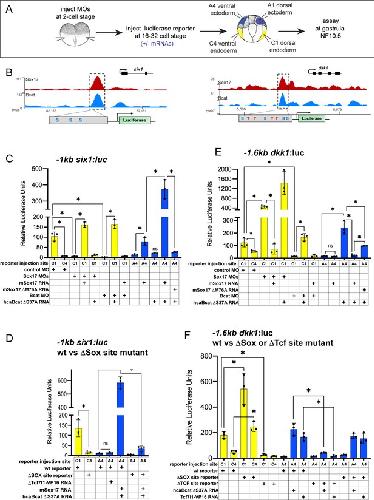 Figure 6. Sox17 and Bcat coordinately regulate endoderm enhancers. (A) Experimental design. (B) IGV genome browser tracks showing Sox17 and Bcat chromatin binding and schematic of reporter constructs showing the predicted Sox17 and Tcf DNA-binding sites in the â1 kb six1 and â1.6 kb dkk1 enhancers (CâF) Luciferase assay of (C) wildtype (wt) â1 kb six1:luc, (D) wt versus DSox-site mutant 1 kb six1:luc, (E) wt â1.6 kb dkk1:luc and (F) wt versus DSox-site and DTcf-site mutant â1.6 kb dkk1:luc reporters injected in different tissue with the indicated MOs and/or mRNAs. Histograms show mean luciferase activity ± standard deviation, *p<0.05 in pairwise Student T-tests. |