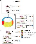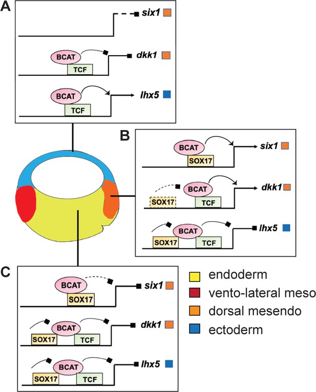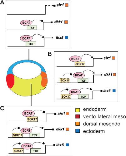 Figure 7. Model of Sox17 and Bcat coregulation spatial transcription. Differential engagement of Sox17, Bcat and Tcfs on enhancers in different cells modulates spatial expression domains. (A) In ectoderm cells lacking Sox17 (and Nodal signaling), ectoderm-specific gene lhx5 is activated through a Bcat/Tcf dependent mechanism while six1 and dkk1 are not transcribed. (B-C) Sox17 is expressed throughout the endoderm and dorsal mesendoderm, while Bcat activity is the higher in dorsal mesendoderm than deep endoderm. (B) In the dorsal region, Sox17 and Bcat synergistically coactivate six1 in the absence of Tcf, whereas Sox17 exerts a repressive influence on Bcat/Tcf-activation of lhx5 and dkk1. We postulate, however, that in the dorsal region Sox17-mediated repression is insufficient to overcome Bcat/Tcf activation of dkk1. (C) In deep endoderm cells where Bcat activity is lower, Sox17-mediated repression of Bcat/Tcf is sufficient to repress dkk1 and lhx5 transcription, but Bcat activity is not high enough to activate six1. |