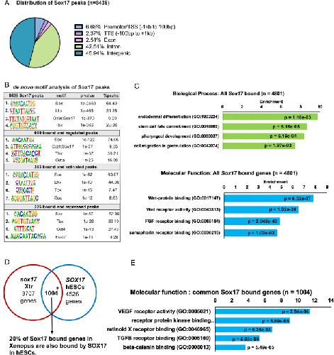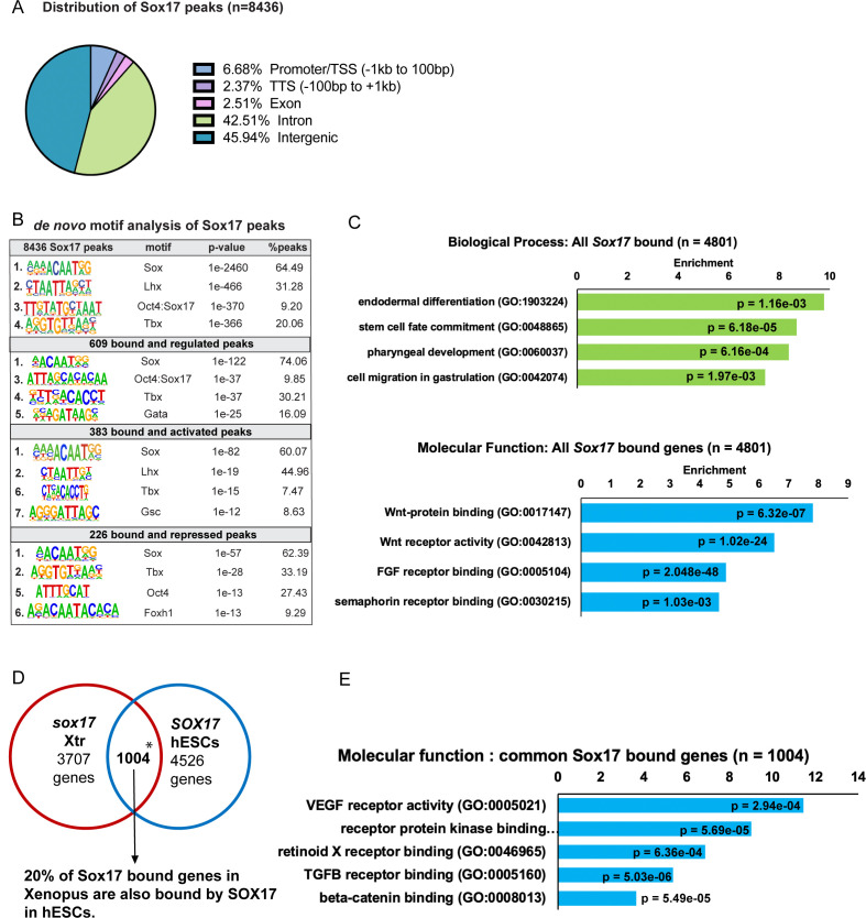 Figure 2âfigure supplement 2. Analysis of Sox17-bound chromatin loci.(A) Genomic distributions of 8436 Sox17-bound ChIP-seq peaks associated to cognate promoters using HOMER. 88% of the Sox17 peaks were located in either introns or elements more than 1 kb from the TSS, indicative of distal CRMs. (B) De novo DNA-binding motif enrichment analysis of Sox17 peaks associated with Sox17-regulated genes by HOMER hypergeometric test. (C) GO analysis of 4810 genes associated with Sox17 ChIP-seq peaks showed enrichment for endoderm development and Wnt signaling. Fold enrichment by Fisherâs exact test with p-values adjusted to 5% FDR for multiple testing correction (D) Comparison of the Xenopus genes associated with Sox17 ChIP-seq peaks to published human SOX17 ChIP-seq from human embryonic stem cell (hESC)-derived definitive endoderm (GSE61475; Tsankov et al., 2015). The extensive overlap between Xenopus and human Sox17-bound genes (*p<0.001 by hypergeometric test) indicates that Sox17 regulates an evolutionarily conserved GRN. The intersection only includes Xenopus genes that have human orthologs, unannotated Xenopus genes were excluded from the analysis. (E) GO term enrichment analysis of the 1004 Sox17-bound genes conserved between Xenopus and human by Fisherâs exact test with p-values adjusted to 5% FDR for multiple testing correction. |