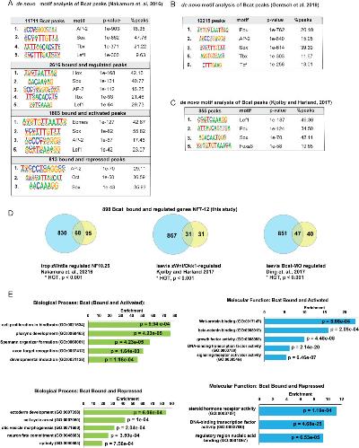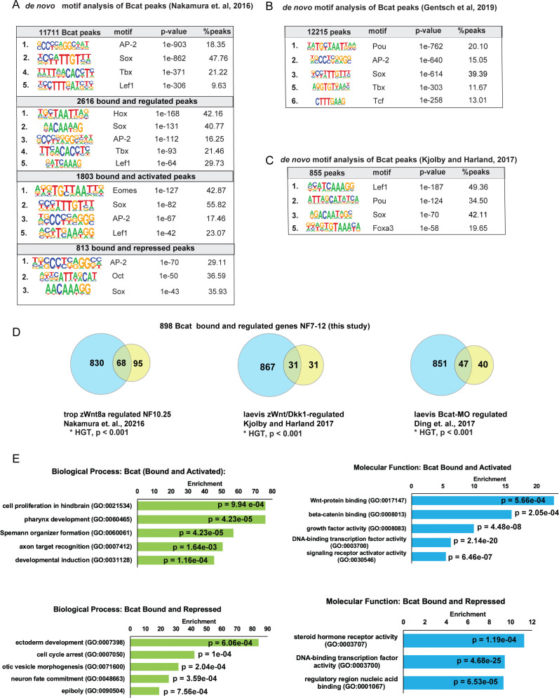 Figure 3âfigure supplement 2. Additional analysis of Bcat ChIP-Seq.(A) De-novo motif analysis of Bcat peaks associated with different groups of Bcat-regulated genes, based on HOMER hypergeometric test. X. tropicalis stage 10.5 gastrula Bcat ChIP-Seq dataset from GSE72657 (Nakamura et al., 2016). (B) De-novo motif analysis of Bcat-bound peaks from St.10+ Bcat ChIP-Seq data from Gentsch et al., 2019. (C) And of Bcat-3xFlag ChIP-Seq peaks from X. laevis stage 11.5 gastrula from GSE77365, Kjolby and Harland, 2017; show a similar enrichment of SOX motifs based on HOMER hypergeometric test. (D) Comparison of differentially expressed Bcat-regulated genes in this study with other recent genomic analysis of gastrula-stage Wnt targets (Ding et al., 2017; Nakamura et al., 2016; Kjolby and Harland, 2017) shows significant overlap, *p<0.001 by hypergeometric enrichment test. (E) GO enrichment analysis of Bcat-bound and -regulated genes bases on Fisherâs exact test with p-values adjusted to 5% FDR for multiple testing correction. |