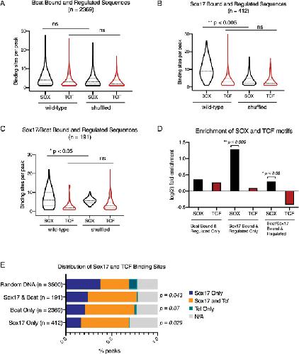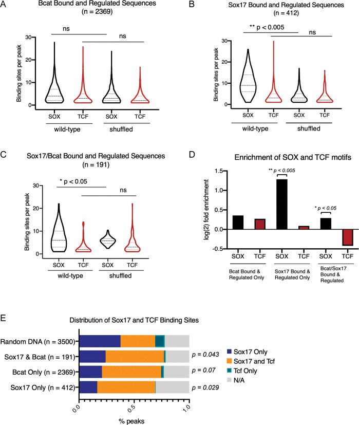 Figure 4âfigure supplement 2. Sox and Tcf DNA-binding motif frequency in Sox/Bcat cooccupied peaks.(AâC) Violin plots show the frequency of Sox and Tcf DNA-binding sites per peak in (A) exclusively Bcat-bound and -regulated peaks (B) exclusively Sox17-bound and -regulated peaks and (C) Sox17/Bcat co-occupied and coregulated peaks. The significance of motif frequency in wild-type test sequences relative to random âshuffledâ background was determined by Fisher exact test (*p<0.05, **p<0.005, ns; not significant). Each wild-type test sequence was randomly scrambled while maintaining dinucleotide frequency to generate âshuffledâ sequences. (D) log2 fold enrichment of Sox and Tcf motif frequencies over random for the three peak categories shown in A-C. (E) Stacked bar charts showing the distribution of Sox and Tcf binding sites in the three groups of enhancers compared to a random set of genomic regions. Distribution of motifs was compared between each group of enhancers and random by two-sided Kolmogorov-Smirnov tests. |