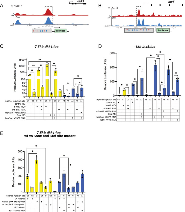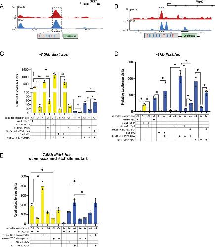 Figure 6âfigure supplement 2. Reporter assays showing Sox17 and Bcat regulated â7.5 kb dkk1 and 1 kb lhx5 enhancers.(AâB) IGV track and schematic of luciferase constructs showing the predicted Sox17 and Tcf DNA-binding sites at the Sox17/Bcat co-occupied (A) â7.5 kb dkk1 and (B) â1 kb lhx5 enhancers. (CâE) luciferase assay of (C) the wildtype â7.5 kb dkk:luc reporter, (D) wildtype â1 kb lhx5:luc reporter and (E) wildtype versus DSox-site and DTcf-site mutant â7.5 kb dkk1:luc reporters injected in different tissues with the indicated MOs and/or mRNAs. Sox17 represses Bcat-Tcf activation of the dkk1 and lhx5 enhancers. Histograms show mean luciferase activity ± standard deviation, *p<0.05 in pairwise Student T-tests. |