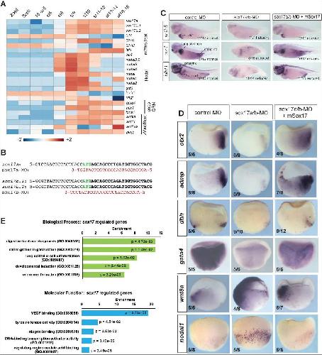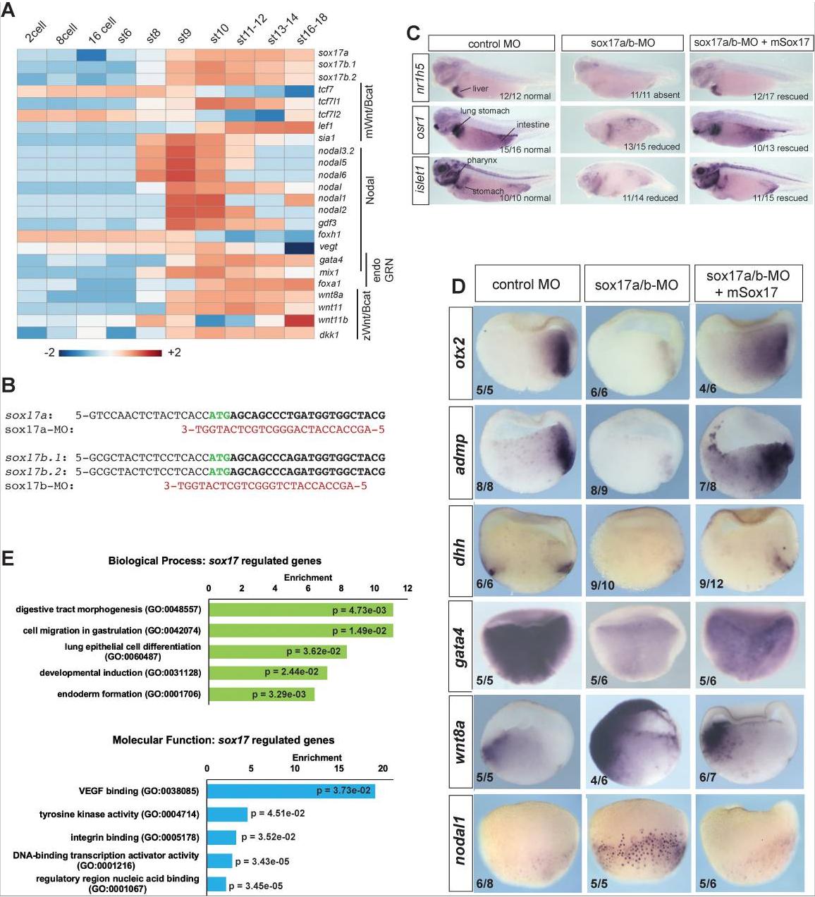 Figure 1âfigure supplement 1. Characterization of Sox17-MO embryos and Sox17-regulated transcriptome. (A) Temporal expression of key endoderm GRN transcripts (GSE65785; Owens et al., 2016). (B) Sequence alignment of antisense sox17a-MO and sox17b-MO (red) with 5â end of Xenopus tropicalis sox17a, sox17b.1 and sox17b.2 mRNAs (black) spanning the ATG translation start (green). (C) In situ hybridization of markers for the liver (nr1h5), stomach, lung, intestine and pharynx (osr1 and islet1) snowing that co-injection of mouse Sox17 RNA rescues gut development in sox17-MO embryos at the tailbud stage. (D) Additional validation of gastrula stage transcripts downregulated (otx2, admp, dhh and gata4) or upregulated (wnt8 and nodal1) in sox17-MO embryos and rescue by co-injection of mSox17. (E) GO term enrichment analysis of Sox17-regulated genes showing fold enrichment by Fisherâs exact test with p-values adjusted to 5% FDR for multiple testing correction. |
