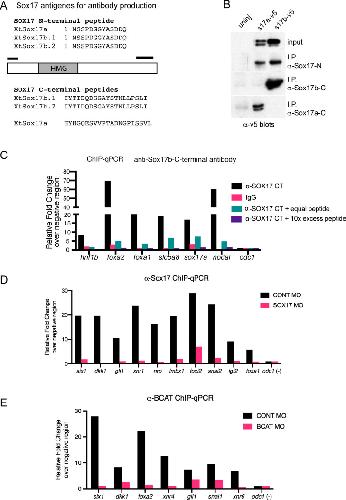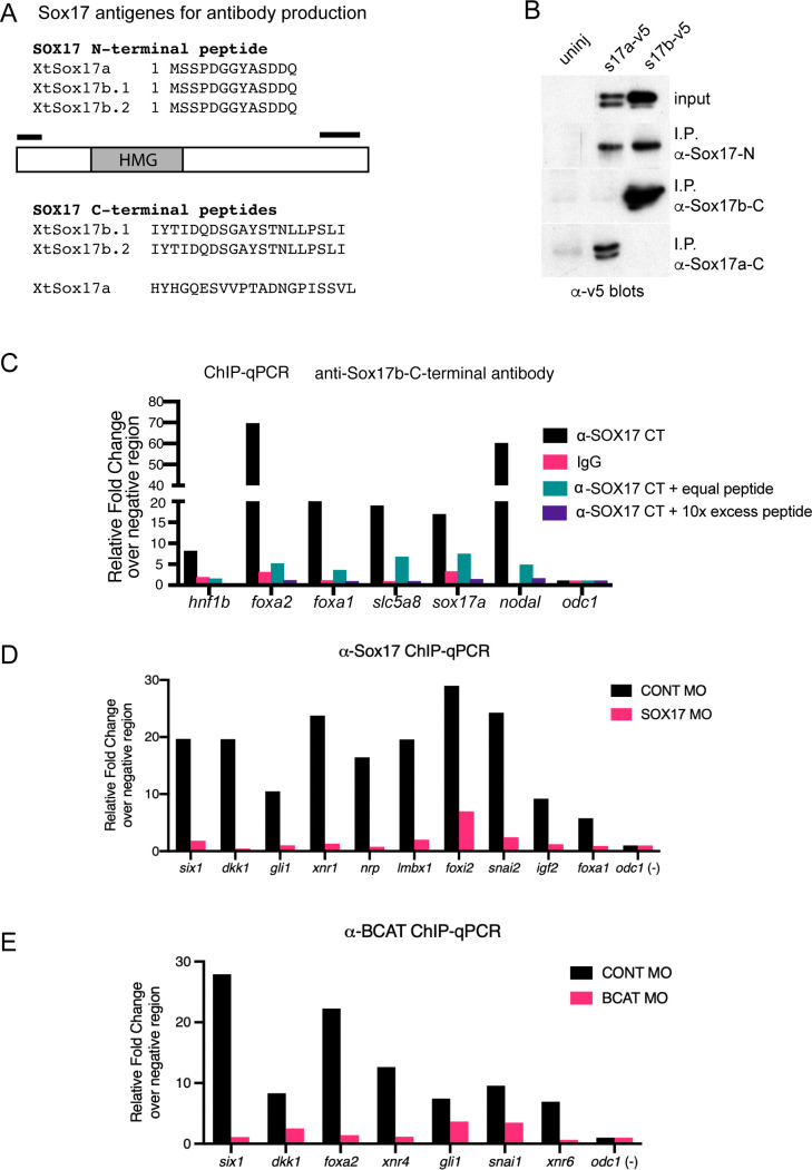 Figure 2—figure supplement 1. Validation of ChIP antibodies.(A) Schematic and amino acid sequences of the Xenopus tropicalis Sox17 peptides used to immunize rabbits and generate polyclonal antibodies to: pan-Sox17 N-terminal, Sox17b Cterminal and Sox17a C-terminal. (B) Immunoprecipitation of Xenopus laevis embryos expressing V5 epitope-tagged versions of Sox17a-V5 and Sox17b1-V5. Anti-V5 western blot showed that all antibodies specifically immunoprecipitated the target antigen but that the Sox17b C-terminal antibody was the most efficient. (C) ChIP-qPCR validation of anti-Sox17 antibodies on previously known target loci. In preliminary ChIP-qPCR experiments, the pan-Sox17 N-terminal and Sox17b C-terminal antibodies bound to all the same loci, but the Sox17b C-terminal antibody showed higher fold enrichment (data not shown) and was used for ChIPseq experiments. Representative ChIP-qPCR results show relative fold change of Sox17b binding versus IgG control in Sox17-bound positive control loci relative to the negative control region of odc1,. Addition of the Sox17b C-terminal peptide reduced the ChIP signal in a dose-dependent manner indicating specific binding. (D) Representative ChIP-qPCR assessing the efficiency of Sox17MO knockdown. Sox17 enrichment at target loci are shown relative to a negative region (odc1) in embryos injected with either control-MO or Sox17-MO. The Sox17-MO dramatically reduces Sox17 occupancy at all loci. (E) Representative ChIP-qPCR assessing the efficiency of Bcat-MO knockdown. Bcat enrichment at target loci are shown relative to a negative region (odc1) in embryos injected with either controlMO or Bcat-MO. The Bcat-MO dramatically reduces its occupancy at all loci. All ChIP-qPCR experiments were repeated at least twice. |
