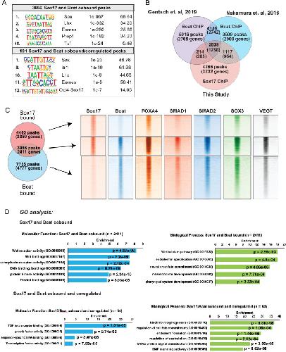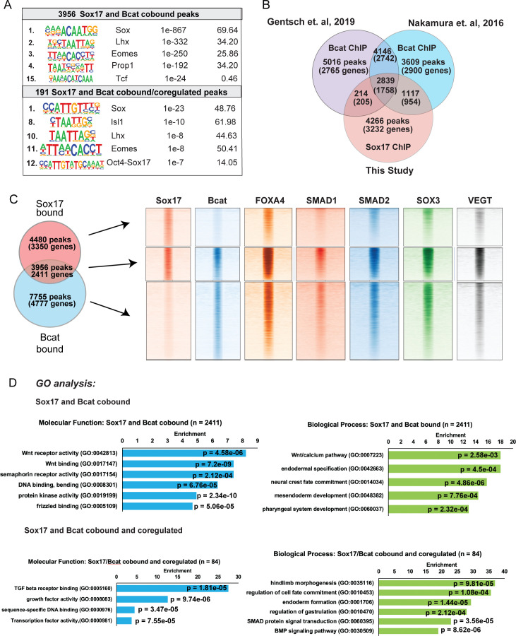 Figure 4—figure supplement 1. Additional analysis of cobound and coregulated peaks.(A) De-novo motif analysis of Sox17 and Bcat bound and/or regulated peaks by HOMER hypergeometric tests. (B) Overlap of Bcat ChIP-Seq datasets from Nakamura et al., 2016 and Gentsch et al., 2019 with Sox17 ChIP-Seq dataset generated in this study. (C) Density plots show that Sox17 and Bcat-cobound peaks are also enriched for binding of other endodermal TFs: Foxa4 GSE85273, Charney et al., 2017b; Smad1, Smad2, Sox3 and VegT (GSE113186, Gentsch et al., 2019). (D) GO enrichment analysis of gene cobound and cobound/coregulated by Sox17 and Bcat peaks bases on Fisher’s exact test with p-values adjusted to 5% FDR for multiple testing correction. |