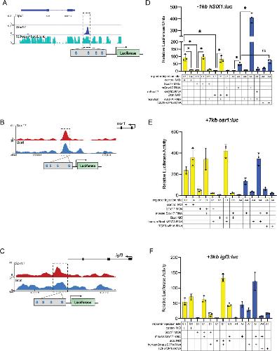 Figure 6—figure supplement 1. Sox17 and Bcat can regulate some enhancers apparently independent of Tcfs.(A) IGV track showing evolutionarily conserved SIX1 peak in human DE (Tsankov et al., 2015). (B, C) IGV tracks and luciferase construct schematic showing predicted Sox17 DNA-binding sites but no detectable Tcf sites at the +7 kb osr1 and +3 kb igf3 enhancers, respectively. (D) Luciferase assay of −1 kb SIX1 enhancer (E, F) Luciferase reporter assays of the construct shown in B and C, respectively. Histograms show mean luciferase activity ± standard deviation, *p<0.05 in pairwise Student T-tests. |