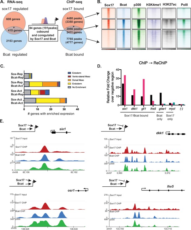 Figure 4. Sox17 and Bcat co-occupy enhancers to regulate the endoderm GRN. (A) Eighty-four genes (191 Peaks) are cobound and coregulated by Sox17 and Bcat. Venn diagram show that 415 genes are regulated by both Sox17 and Bcat (left), whereas 2411 genes (3956 peaks) are bound by both Sox17 and Bcat. Gene intersections are significant based on hypergeometric tests, *p<0.001. (B) Density plots show that Sox17 and Bcat cobound peaks are enriched for enhancer associated epigenetic marks: Ep300, H3K4me1 and H3K27Ac and RNA pol II. (C) Regional enrichment of all subsets of enhancers cobound and coregulated by Sox17 and Bcat. (D) A representative ChIP-reChIP experiment showing that Sox17 and Bcat coocupy all the test CRMs (six1, dkk1, gli1 and lhx5) in the same cells, in contrast to the gtse1 locus, which is bound only by Bcat. (E) Genome browser views of representative genes showing peak overlap of Sox17, Bcat and Ep300 ChIP-Seq tracks. |