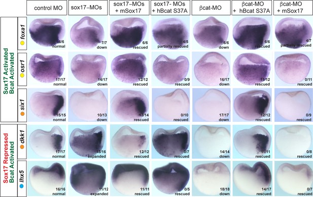Figure 5. Sox17 and Bcat epistasis. In situ hybridization of gastrula embryos (dorsal right) injected with sox17-MO or bcat-MO, some of which were co-injected with RNA encoding either mSox17 or a human S37A stabilized Bcat. The genes osr1, six1 and foxa1 are activated by both Sox17 and Bcat, whereas dkk1 and lhx5 are activated by Bcat but repressed by Sox17. Co-injection of mSox17 cannot rescue normal expression in Bcat-MOs, nor can hBcat S37A RNA rescue Sox17-MOs indicating that both Sox17 and Bcat required for normal expression. |
