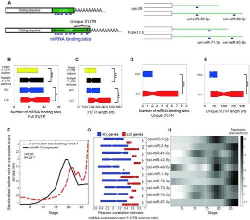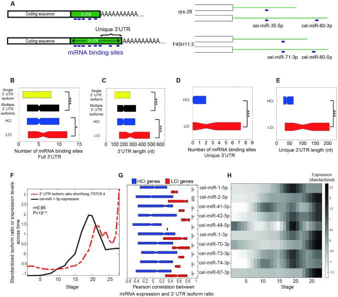 Figure 4. Genes with multiple, lowly correlated 3′ UTR variants show evidence for increased miRNA regulation. (A) The left panel shows a schematic representation of the miRNA analysis. The length of the 3′ UTR region, the number of basic miRNA seed matches, and the 3′ UTR region unique to the longer 3′ UTR isoform were considered. The right panel shows two examples of genes and their miRNA binding sites. (B) Boxplots indicating the number of miRNA binding sites in the full 3′ UTR regions of genes with single or multiple 3′ UTR isoforms, highly correlating (HCI) or lowly correlating isoforms (LCI). Genes with multiple 3′ UTR variants have significantly more miRNA targets than genes with a single variant (P< 10−12, Mann–Whitney test). Between multiple 3′ UTR isoform genes, LCI genes have significantly more miRNA binding sites than HCI genes (P< 0.02, Mann–Whitney test). (C) Same as B for the full 3′ UTR lengths of genes. Genes with multiple 3′ UTR variants have significantly longer 3′ UTRs than single isoform genes (P< 10−28, Mann–Whitney test). Within multiple isoform genes, LCI genes have significantly longer 3′ UTRs than HCI genes (P< 10−3, Mann–Whitney test). (D) Boxplots indicating the number of miRNA binding sites in the unique 3′ UTR region of the longer 3′ UTR isoform across HCI and LCI genes. LCI genes have significantly more miRNA binding sites in their unique 3′ UTR region than HCI genes (P< 10−3, Mann–Whitney test). (E) Boxplots indicating the length of the unique 3′ UTR region across HCI and LCI genes. LCI genes have significantly longer unique 3′ UTR regions than HCI genes (P< 10−4, Mann–Whitney test). (F) Correlating expression of miRNA expression with expression ratio dynamics between 3′ UTR isoforms. The black line shows the expression profile of cel-miR-1–5p miRNA throughout the developmental time-course. Depicted in red is the ratio between the expression profiles of the two 3′ UTR isoforms (short/long) of the F07C6.4 gene. The Pearson correlation coefficients between 3′ UTR isoform ratio and miRNA expression of all target genes were used for the analysis shown in G and H. (G) For the indicated miRNAs, the boxplots show the distribution of correlations between miRNA expression and 3′UTR isform ratio showing a significant difference between the HCI and LCI gene groups (out of 64 miRNAs with dynamic expression, see Supplementary Table S2 for statistics for all miRNAs). All ten exhibit a positive median correlation between miRNA expression and the 3′ UTR isoform expression ratio of genes it is predicted to bind (as in F). Further, this correlation is significantly higher in LCI than in HCI genes. (H) Heatmap of the standardized expression dynamics of the ten indicated miRNAs which show differences between HCI and LCI genes across development. |