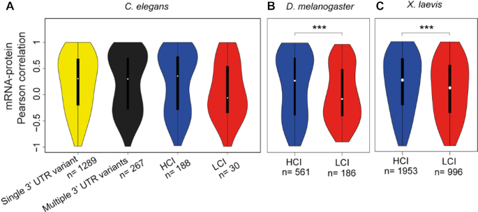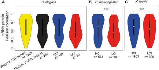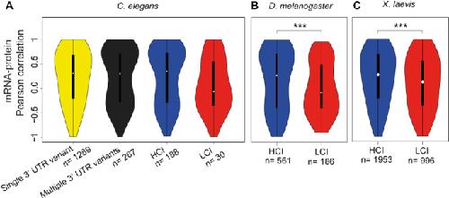 Figure 5. Genes with lowly correlated 3′ UTR isoforms (LCI genes) have a lower correspondence between total mRNA and protein expression. (A) Violin plots indicate the distribution of Pearson correlation coefficients between total mRNA and protein expression levels across developmental stages for C. elegans genes with one and multiple 3′ UTR isoforms, highly correlating (HCI), and lowly correlating isoforms (LCI). (B, C) Same as A, for LCI and HCI genes in Drosophila melanogaster (B) and Xenopus laevis (C) embryonic development. |