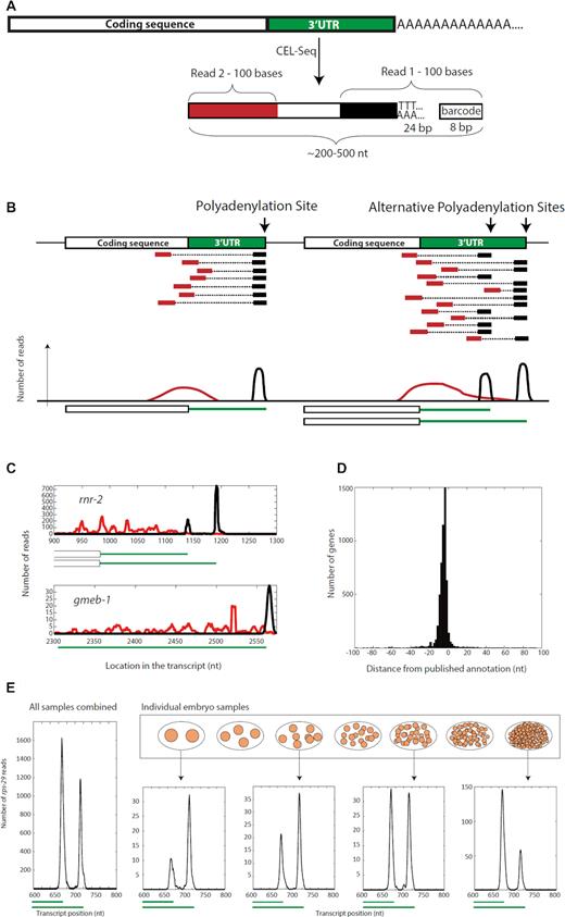 Figure 1. APA-seq measures expression levels of distinct 3â² UTR isoforms in individual C. elegans embryos. (A) APA-seq identifies gene expression levels for distinct alternatively polyadenylated isoforms. APA-seq is an adaptation of the CEL-Seq method which utilizes paired-end reads: Read 1 contains a sample-specific barcode while Read 2 identifies the transcript. If sequenced long enough (100 bp in our case), Read 1 also provides information on the exact location of the polyadenylation site. APA-seq thus uses Read 2 to identify the expressed gene and then maps Read 1 to the gene specific region, thus enabling unique mapping in spite of the low sequencing quality that results from sequencing through the low-complexity poly-T region. (B) Plotting the 3â²ends of Read 2 sequences results in a wide distribution within the gene (red peak) due to the fragmentation step of library preparation. However, the 3â²ends of Read 1 sequences all map to the site immediately upstream of the poly-A tail thus producing a clear peak (black peak) when mapped to the gene sequence and revealing exact polyadenylation sites. The white boxes at the bottom of the distribution plots mark the coding sequence, while the green lines indicate the determined 3â² UTR regions. (C) Using the APA-seq method enables detection of the exact location of polyadenylation sites in C. elegans. The green lines at the bottom of each plot mark previously annotated 3â² UTRs (41) for the indicated gene, showing good agreement with the APA-seq Read 1 peaks (black). (D) Global comparison of the detected polyadenylation sites using APA-seq to the C. elegans UTRome annotation (41) shows high consistency between the two datasets. (E) The expression of two unique 3â² UTR isoforms for the C. elegans rps-29 gene throughout embryogenesis. Although in total (leftmost panel) the 3â² UTR variants show equal expression, examining expression across developmental stages shows predominant expression of the shorter 3â² UTR variant during early embryogenesis, and the inverse later in development. |