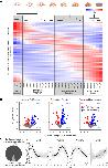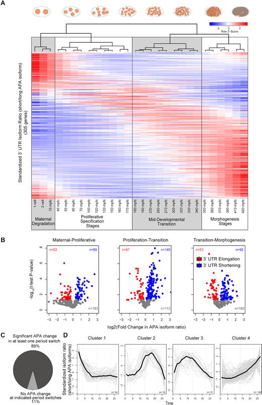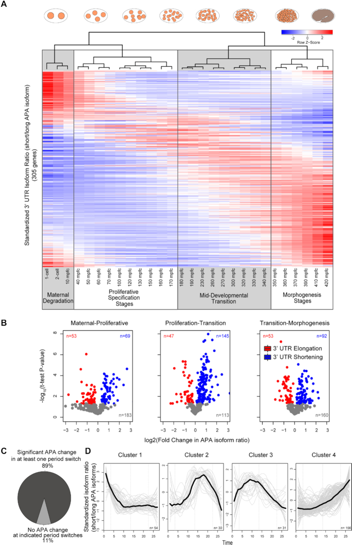 Figure 2. 3′ UTR isoform expression throughout C. elegans embryogenesis. (A) Heatmap showing the relative expression of 3′ UTR isoforms for 305 genes which passed overall expression and 3′ UTR isoform dynamics threshold throughout C. elegans embryogenesis. Each row in the heatmap corresponds to a gene and indicates the ratio between the expression of its short and long isoforms. Red and blue indicate the maximum and minimum 3′ UTR ratio for each gene, respectively. White and grey shadowed boxes indicate sets of developmental stages with similar isoform usage (based on Ward clustering, see clustergram on top of the heatmap) and identify the periods of major isoform switches. mpfc = minutes past four-cell stage. (B) The plots indicate the fold-change and P-value of difference in the isoform ratios for pairs of successive periods as defined by Ward clustering in (A). Red and blue colouring indicates significant elongation and shortening events, respectively. Grey colouring indicates insignificant changes. (C) Most of significant 3′ UTR isoform switches occur between the identified developmental switch periods. 89% (271) of the genes show significant changes in 3′ UTR usage in at least one of the identified period switches. (D) Clusters of significant 3′ UTR isoform changes indicate four main patterns—almost constant elongation or shortening over time (Clusters 1 and 4, respectively) or peaking shortening during mid-developmental transition and proliferative periods (Clusters 3 and 4, respectively). The thick black line indicates the mean 3′ UTR isoform ratio profile of all genes in the cluster and individual genes profiles are shown as thin grey lines. |