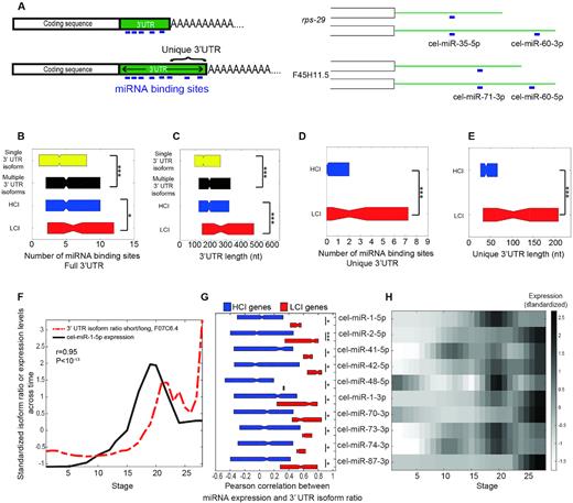 Figure 4. Genes with multiple, lowly correlated 3â² UTR variants show evidence for increased miRNA regulation. (A) The left panel shows a schematic representation of the miRNA analysis. The length of the 3â² UTR region, the number of basic miRNA seed matches, and the 3â² UTR region unique to the longer 3â² UTR isoform were considered. The right panel shows two examples of genes and their miRNA binding sites. (B) Boxplots indicating the number of miRNA binding sites in the full 3â² UTR regions of genes with single or multiple 3â² UTR isoforms, highly correlating (HCI) or lowly correlating isoforms (LCI). Genes with multiple 3â² UTR variants have significantly more miRNA targets than genes with a single variant (P< 10â12, MannâWhitney test). Between multiple 3â² UTR isoform genes, LCI genes have significantly more miRNA binding sites than HCI genes (P< 0.02, MannâWhitney test). (C) Same as B for the full 3â² UTR lengths of genes. Genes with multiple 3â² UTR variants have significantly longer 3â² UTRs than single isoform genes (P< 10â28, MannâWhitney test). Within multiple isoform genes, LCI genes have significantly longer 3â² UTRs than HCI genes (P< 10â3, MannâWhitney test). (D) Boxplots indicating the number of miRNA binding sites in the unique 3â² UTR region of the longer 3â² UTR isoform across HCI and LCI genes. LCI genes have significantly more miRNA binding sites in their unique 3â² UTR region than HCI genes (P< 10â3, MannâWhitney test). (E) Boxplots indicating the length of the unique 3â² UTR region across HCI and LCI genes. LCI genes have significantly longer unique 3â² UTR regions than HCI genes (P< 10â4, MannâWhitney test). (F) Correlating expression of miRNA expression with expression ratio dynamics between 3â² UTR isoforms. The black line shows the expression profile of cel-miR-1â5p miRNA throughout the developmental time-course. Depicted in red is the ratio between the expression profiles of the two 3â² UTR isoforms (short/long) of the F07C6.4 gene. The Pearson correlation coefficients between 3â² UTR isoform ratio and miRNA expression of all target genes were used for the analysis shown in G and H. (G) For the indicated miRNAs, the boxplots show the distribution of correlations between miRNA expression and 3â²UTR isform ratio showing a significant difference between the HCI and LCI gene groups (out of 64 miRNAs with dynamic expression, see Supplementary Table S2 for statistics for all miRNAs). All ten exhibit a positive median correlation between miRNA expression and the 3â² UTR isoform expression ratio of genes it is predicted to bind (as in F). Further, this correlation is significantly higher in LCI than in HCI genes. (H) Heatmap of the standardized expression dynamics of the ten indicated miRNAs which show differences between HCI and LCI genes across development. |