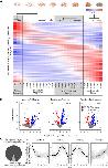 Figure 3. Genes with constitutive overall expression have dynamically expressed 3â² UTR isoforms. (A) Expression heatmaps indicating 3â² UTR isoform expression for 16 genes with multiple isoforms displaying varying levels of correlation between the expression of their 3â² UTR isoforms. The Pearson correlation coefficient r for each of the genes displayed is indicated at the top of each heatmap. (B) Relationship between 3â² UTR isoform expression correlations and the overall expression dynamics. Genes whose 3â² UTR isoform expression levels are correlated are more dynamic in their overall expression (r = 0.94, P = 0.03, second degree polynomial regression test). Dynamics for each gene is defined as the fold differences between its maximum and minimum expression values throughout the time-course. Red and gray horizontal bars represent the median and the interquartile ranges of the data, respectively. The last bin with highest 3â² UTR isoform correlations exhibit significantly higher overall expression dynamics than the preceding bin (P< 10â20, MannâWhitney test). (C) Relationship between 3â² UTR isoform expression correlations and the respective overall total mRNA expression levels. Genes whose 3â² UTR isoform expression levels are uncorrelated show significantly higher overall expression levels (r = 0.99, P = 0.002, second degree polynomial regression test). Red and grey horizontal bars represent the median and the interquartile ranges of the data, respectively. (D) Heatmaps in the two leftmost panels show standardized expression of the 3â² UTR isoforms of 545 genes belonging to the group of genes whose 3â² UTR isoform's expression show high correlation (HCI genes). The right panel shows a heatmap of the total mRNA expression (on a log10 scale) of the same genes confirming that genes with highly correlated isoform expression are also dynamically expressed. The time points are the same as indicated in Figure 2A. (E) Same as D for 79 genes belonging to the group of genes whose 3â² UTR isoform's expression show low correlation (LCI genes). Genes with distinct expression profiles of 3â² UTR isoforms appear constitutively expressed when examined at the total gene expression level. |