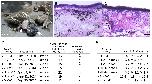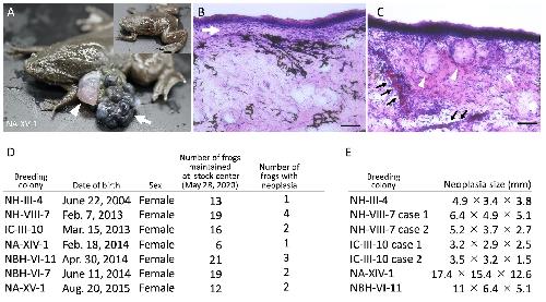 Figure 1. : (AâC) Representative images of spontaneous neoplasia in Xenopus tropicalis. (A) External morphology of the neoplasia. The arrow indicates the black stone-like nodules, and the arrowhead indicates the white-red nodules. The upper right panel depicts the frog for which the neoplasia was resected. (B) The layered structure in the black stone-like nodules. Hematoxylinâeosin (HE) staining of a histological section of the black stone-like nodule. The white arrow indicates the layered structure. Scale bar indicates 50 μm. (C) The cyst-like structures and blood vessels in the white-red nodule. HE staining of a section of the white-red nodule. The white arrowheads indicate cyst-like structures and the black arrows blood vessels. Scale bar indicates 50 μm. (D) A table showing the number of frogs with neoplasia in each colony. Regarding colony names, the first 2â3 alphabets indicate the strain names, the following Greek numbers indicate the inbred generations, and the Arabic numbers (with case numbers) indicate the colony identifiers. Most of the frogs maintained at the stock center were shipped to users as animal resources, and the remaining frogs as of May 28, 2020, were subjected to this analysis. (E) A table showing the size of neoplasia; the size was determined by measuring diameters at large and small ends, and the height above the skin surface for each neoplasia.