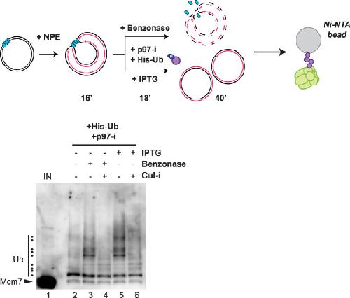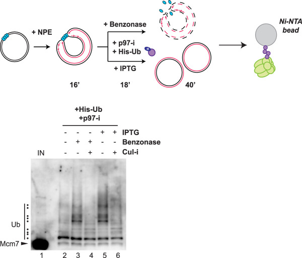 Figure 5. Release of CMG from DNA results in Mcm7 ubiquitylation. Replication forks were stalled at the outer edges of a LacR array via sequential incubation of a LacR array containing plasmid in HSS and NPE. Reactions were then treated with benzonase to digest the plasmid or incubated with IPTG to promote termination. His-Ub was added to the extracts at the same time as IPTG or benzonase. Proteins pulled down with Ni-NTA beads under denaturing conditions were blotted for Mcm7. Ubiquitylated species are indicated by the dots on the left of the image. Samples were also removed for DNA analysis (Supplemental Fig. S5B).