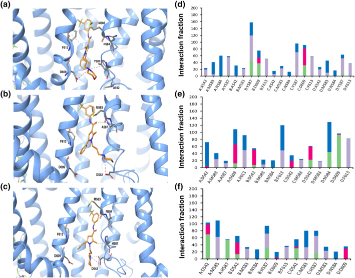 FIGURE 2. Predicted model of HC067047 interaction with mutant xTRPV4 systems. (a–c) Images corresponding to the last conformation of HC067047 on the binding pocket after 500‐ns MD in the xTRPV4‐D542A (a), xTRPV4‐Y587A (b) and xTRPV4‐Y587H (c) systems. (d–f) Interaction fraction plots depicting protein–HC067047 contacts during the course of 500‐ns MD simulation in the xTRPV4‐D542A (d), xTRPV4‐Y587A (e) and xTRPV4‐Y587H systems (f). Hydrophobic interactions, H bonds, ionic interactions and water bridges are shown in purple, green, fuchsia and blue, respectively. The stacked bar charts are normalized over the course of the trajectory: for example, a value of 0.7 suggests that 70% of the simulation time the specific interaction is maintained. Values over 1.0 are possible as some protein residue may make multiple contacts of same subtype with the ligand
