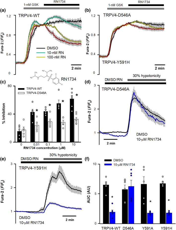 FIGURE 5. HC067047 binding pocket is partially shared by the inhibitor RN1734. (a, b) Changes in intracellular [Ca2+] in HeLa cells transfected with hTRPV4‐WT (a) or hTRPV4‐D546A (b) cDNAs, after perfusion with 1‐nM GSK1016790A and addition of RN1734 (or vehicle) at the indicated concentrations at time t = 0. Traces are means ± SEM of 47 (DMSO), 81 (10 nM), 78 (100 nM), 82 (1 μM) and 93 (10 μM) cells expressing TRPV4‐WT and 72 (DMSO), 75 (10 nM), 80 (100 nM), 78 (1 μM) and 60 (10 μM) cells expressing TRPV4‐D546A. (c) Percentage inhibition of GSK1016790A‐induced increases in intracellular Ca2+ at different RN1734 concentrations. N = 5 for all conditions except 10‐nM and 10‐μM HC067047 TRPV4‐WT (n = 6) and 10‐μM HC067047 TRPV4‐D546A (n = 7). (d, e) Changes in intracellular [Ca2+] (means ± SEM) in HeLa cells transfected with hTRPV4‐D546A (d) or hTRPV4‐Y591H (e) cDNAs, after perfusion with a 30% hypotonic solution in the presence (D546A, n = 83; Y591H, n = 88) or absence (D546A, n = 78; Y591H, n = 75) of 10‐μM RN1734. (f) AUC in HeLa cells transfected with the indicated cDNAs and exposed to 30% hypotonic solutions in the presence or absence of 10‐μM RN1734. N number of experiments from left to right: 5, 6, 5, 7, 6, 6, 6 and 6