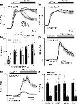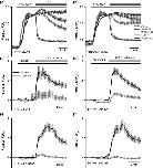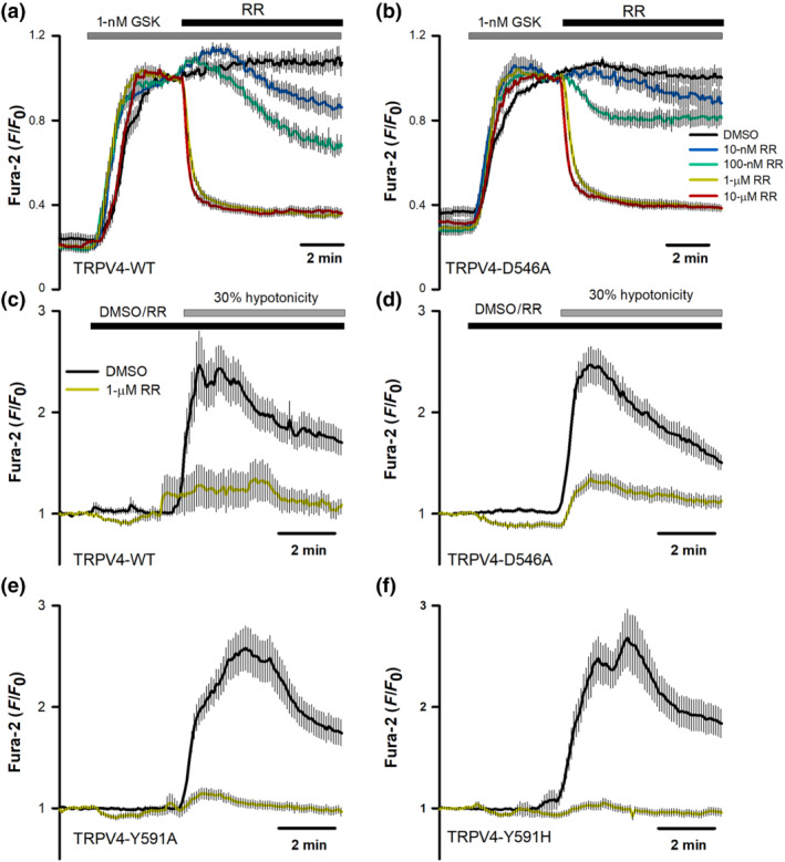 FIGURE 6. Mutations in hTRPV4 residues D546 and Y591 do not affect channel inhibition by ruthenium red. (a, b) Changes in intracellular [Ca2+] in HeLa cells transfected with hTRPV4‐WT (a) or hTRPV4‐D546A (b) cDNAs, after perfusion with 1‐nM GSK1016790A and addition of ruthenium red (or vehicle) at the indicated concentrations at time t = 0. Traces are means ± SEM of 48 (DMSO), 75 (10 nM), 67 (100 nM), 95 (1 μM) and 70 (10 μM) cells expressing TRPV4‐WT and 72 (DMSO), 53 (10 nM), 63 (100 nM), 73 (1 μM) and 80 (10 μM) cells expressing TRPV4‐D546A. (c–f) Changes in intracellular [Ca2+] in HeLa cells transfected with hTRPV4‐WT (c), D546A (d), Y591A (e), or Y591H (f) cDNAs, after perfusion with a 30% hypotonic solution in the presence or absence of 1‐μM ruthenium red (RR). N values for DMSO in WT, D546A, Y591A and Y591H are 23, 31, 27 and 35, respectively. N values for RR in WT, D546A, Y591A and Y591H are 30, 33, 31 and 34, respectively. Statistical analysis of the effect of RR on wild‐type versus mutant TRPV4 channels activated by GSK1916790A or hypotonicity reported a P > 0.05 for all conditions tested in panels (a)–(f), except for the comparison of the values obtained with 100‐nM RR in the presence of GSK (panels a and b) which was 0.04