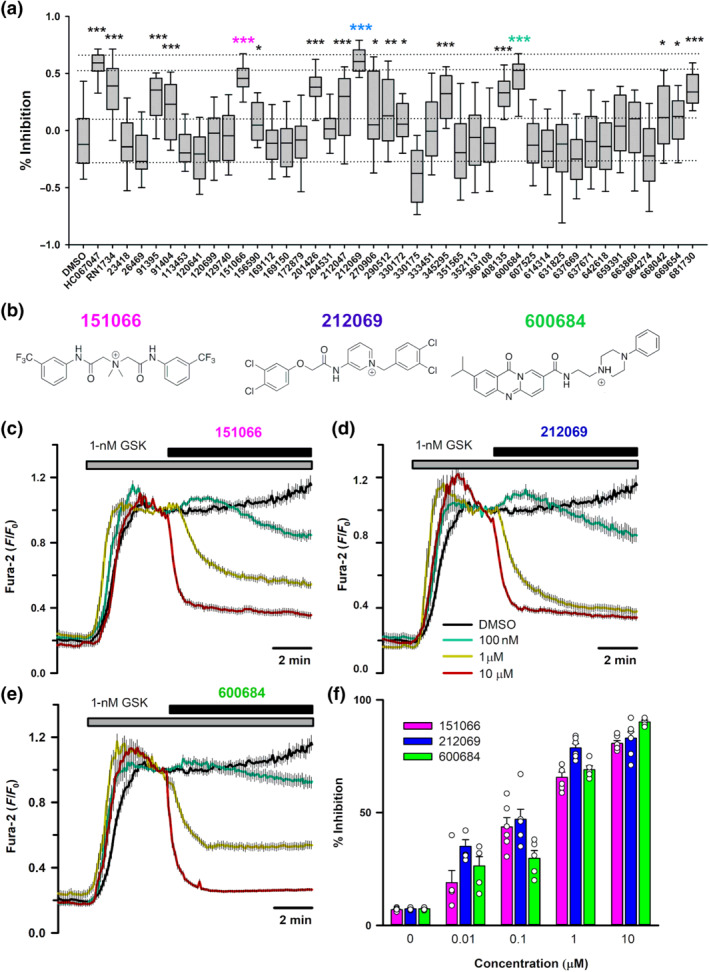 FIGURE 7. Effect of selected hits from the structure‐based screening on hTRPV4 channel activity. (a) Percentage of inhibition of hTRPV4‐WT transfected in HeLa cells and activated by 1‐nM GSK1016790A in the presence of different compounds and known channel inhibitors at 1 μM (n ≥ 26 for each compound). (b) Chemical structures of three hits selected for further analysis. (c–e) Changes in intracellular [Ca2+] in HeLa cells transfected with hTRPV4‐WT cDNA after perfusion with 1‐nM GSK1016790A and addition of 151066 (c), 212069 (d) and 600684 (e) at the indicated concentrations at time t = 0. Traces are means ± SEM of 52, 46, 57, 57 and 67 cells for compound 151066; 47, 39, 51, 46 and 67 cells for compound 212069; and 67, 39, 48, 57 and 50 cells for compound 600684. (f) Percentage inhibition of GSK1016790A‐induced increases in intracellular Ca2+ at different concentrations of 151066 (N = 5, 5, 6, 6 and 6), 212069 (N = 5, 5, 6, 6 and 7) and 600684 (N = 5 for all concentrations)