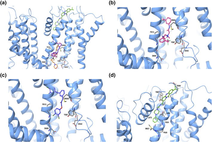FIGURE 8. Interaction of new compounds with residues of the binding pocket. (a) Image corresponding to the last conformation of HC067047 (orange), 151066 (fuchsia), 212069 (blue) and 600684 (green) on the binding pocket of TRPV4 after 500‐ns MD. (b) Close up image of 151066 interactions. (c) Close up image of 212069 interactions. (d) Close up image of 600684 interactions. Hydrophobic interactions, H bonds and ionic interactions are shown in dashed lines in purple, fuchsia and green, respectively
