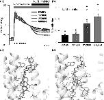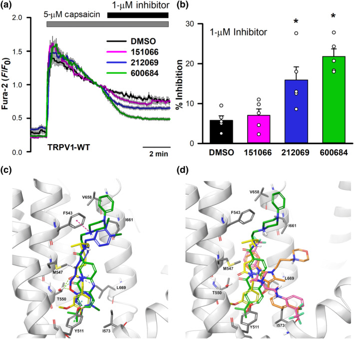 FIGURE 10. Interaction of new compounds with TRPV1. (a) Changes in intracellular [Ca2+] in HeLa cells transfected with hTRPV1 (DMSO, n = 40; 151066, n = 40; 212069, n = 43; 600684, n = 36 cells) after perfusion with 5‐μM capsaicin and addition of DMSO, or the indicated compounds at 1 μM. (b) Percentage inhibition of capsaicin‐induced increases in intracellular Ca2+ concentrations generated by TRPV1 (n = 5 for all conditions). (c) Image corresponding to the binding of capsaicin (yellow), 212069 (blue) and 600684 (green) on the binding capsaicin pocket of TRPV1. (d) Image similar to (c) with the addition of HC067047 (orange) and 151066 (fuchsia)
