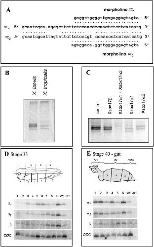 Xsox17 a1 morpholinos (10 ng, as in panel 1). (A) Stage 31 phenotypes produced by the Xsox17a1 oligo, the control being shown in (B). (C) Is a control