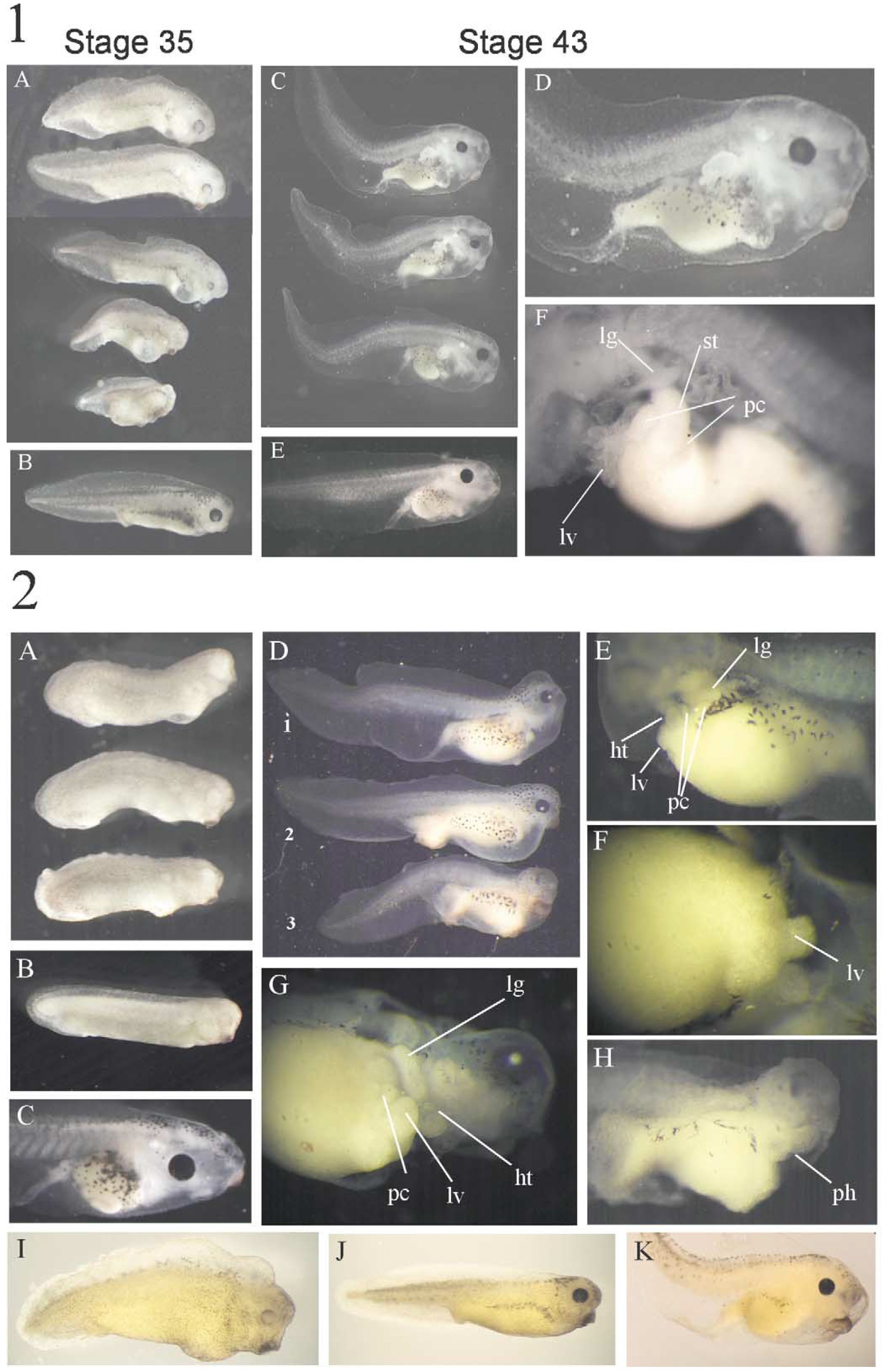 Fig. 3. Late effects of anti-Xsox17b and a1 morpholinos. Panel 1. Anti-Xsox17b morpholino (10 ng). (A) A range of phenotypes at stage 35 produced by a total