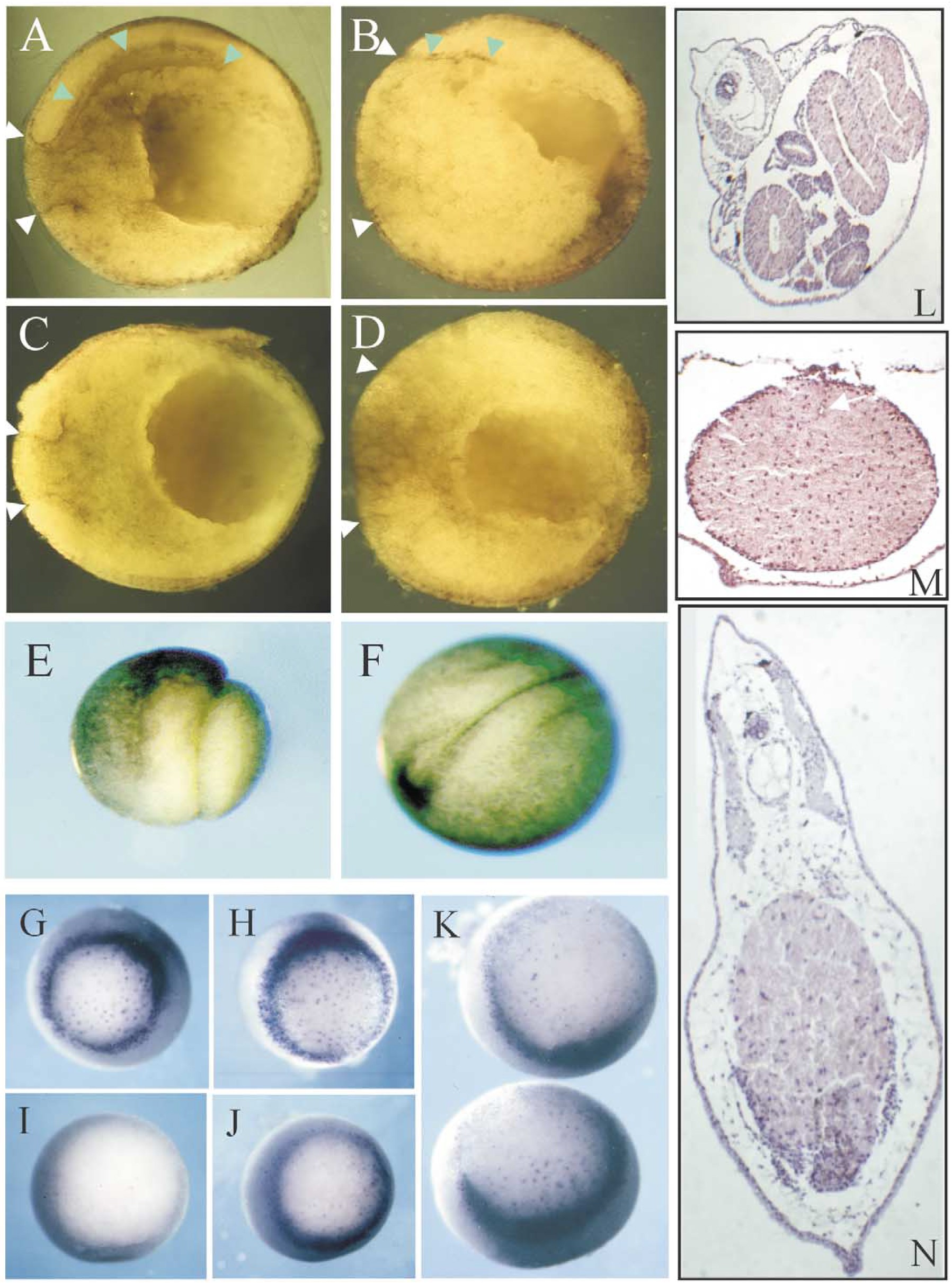blastopore are arrowed in white and the archenteron roof in green. (E) Shows a blocked stage 16 embryo injected with 750 pg Xsox17b::En R mRNA, the