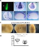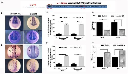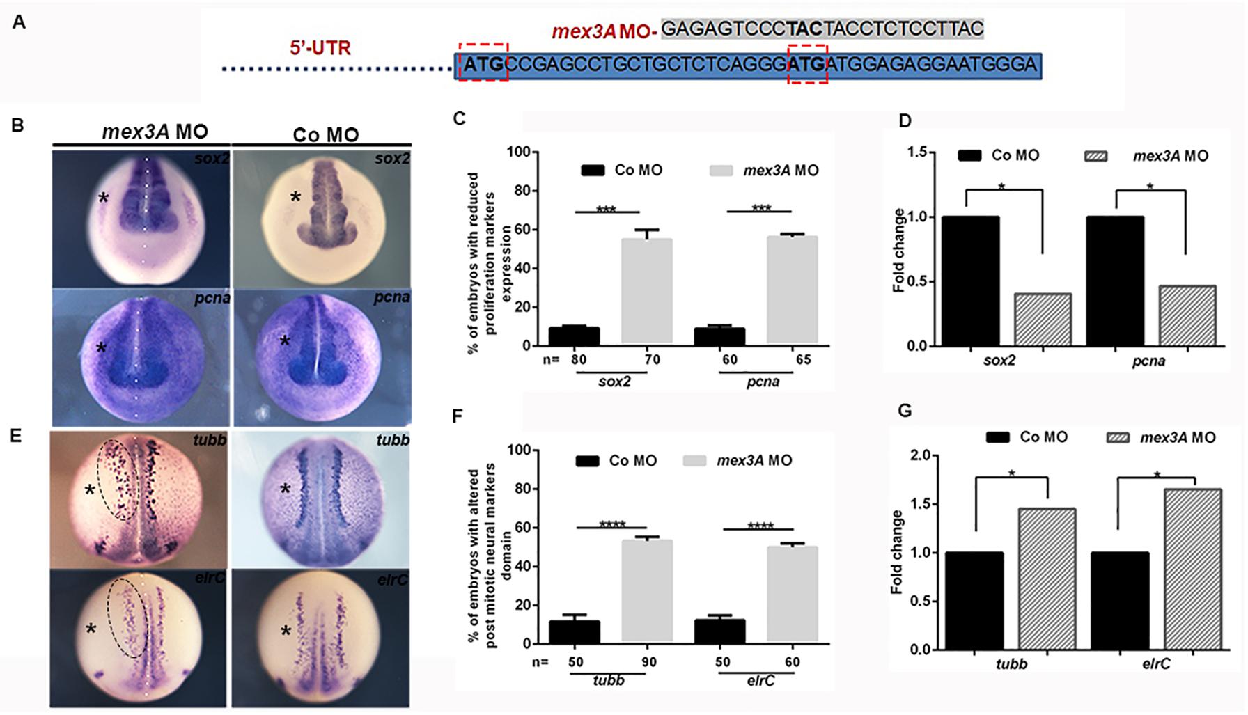 Figure 2. (A) Embryos injected with gfp (250 pg) and mex3A (500 pg) mRNA in one dorsal blastomere at the four-cells stage showing fluorescence only in the neural plate at neurula stage were cultured till different stages of development for WISH analysis. In each panel the asterisk (*) indicates the injected side of the embryo. (B,C) mRNA distribution of sox2 and msi-1 (sox2 phenotype 54%, n = 116; msi-1 phenotype 50%, n = 80) in mex3A overexpressing embryos. The arrow in (D) showed the lack of elrC expression in the anterior neural plate. (DâEâ²) mRNA distribution of elrC at 18 (phenotype 54%, n = 114, D) and at 23 (phenotype 57%, n = 70, E,Eâ²) stages in mex3A overexpressing embryos. The arrow in (Eâ²) shows the lack of neurons in the anterior neural tube. (F,G) pH3 positive cells were counted in the areas defined by the black rectangles. Statistical evaluation of the data is shown (n = 40). Abbreviations: n total number of processed embryos; error bars indicate standard error of the means (SEM); ***p ⤠0.001.