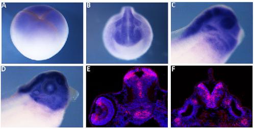 FIGURE 1. The spatial expression pattern of Xenopus mex3A. Whole mount in situ hybridization approaches show that mex3A is expressed in the central nervous system. (A)