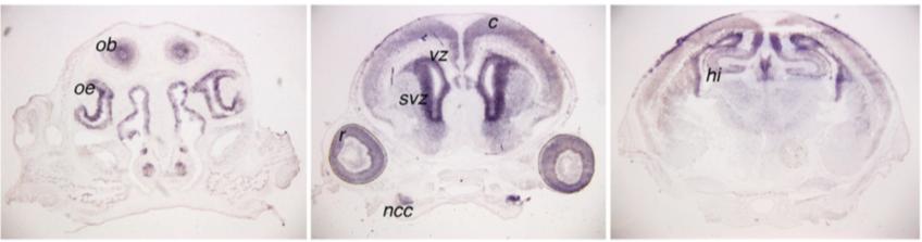 Coronal cryostat sections of mouse embryo (embryonic day 18) processed by in situ hybridization to visualize mex3a expression pattern. Ob, olfactory bulbs; oe, olfactory epithelium; r, retina; c telencephalic cortex; vz, ventricular cortical zone; svz subventricular zone of basal ganglia; ncc, cartilagineous derivatives of neural crest cells; hi, developing hippocampal formation.
