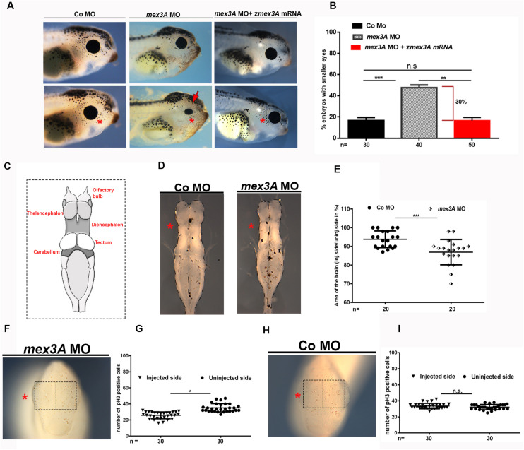 Figure 4. The inhibition of mex3A function causes defects in anterior neuronal development. In each panel, the asterisk indicates the injected side of the embryo (A) Representative images and (B) quantification of the effect of injection of mex3A-MO and co-injection of mex3A-MO with zebrafish mex3A mRNA on the eye phenotype. (C) Image showing the anatomy of Xenopus brain. Diagrams showing a dorsal view of isolated brains. (D) Bright field images of Xenopus brains at stage 41, anterior to the top after unilateral injection of mex3A-MO or CoMO. (E) Statistical evaluation of the brain size in injected embryos. (FâI) pH3 staining in mex3A-deficient embryos at stage 24. Mex3A depletion leads to a significant reduction of proliferating cells compared to the un-injected side, whereas the CoMO injection does not influence on proliferation. pH3 positive cells were counted in the areas defined by the black rectangles. Statistical evaluations of the data are shown. Statistical quantifications of the data are given. Abbreviations: n, total number of evaluated embryos in total; SEM, error bars indicate standard error of the means; ns, not significant. *p ⤠0.05; **p ⤠0.01; ***p ⤠0.001.