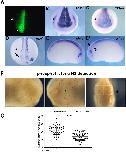 Figure 1. The spatial expression pattern of Xenopus mex3A. Whole mount in situ hybridization approaches show that mex3A is expressed in the central nervous system. (A) Mex3A expression at blastula stage (stage 3). (B,C) At neurula (stage 20) and at tadpole stages (stage 27), mex3A is expressed in: neural tube, developing eye, neural crest cells (white arrowhead) and otic vesicle (white arrow). At stage 37, an accumulation of mex3A transcript persisted in the most anterior region of the central nervous system (D). (E,F) In situ hybridization on frozen tissue of transverse sections on WT embryos at stage 41. ISH signal was revealed using fluorescent Fast Red and is visualized in red. Nuclei were revealed in blue with Hoechst. (E,F) Mex3A is expressed in CMZ of the retina (red arrow), in ventricular zone of the midbrain and in subventricular zone of the hindbrain.