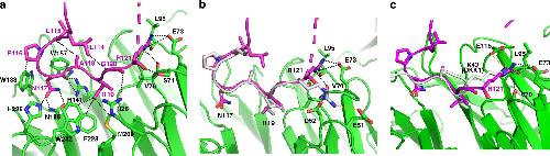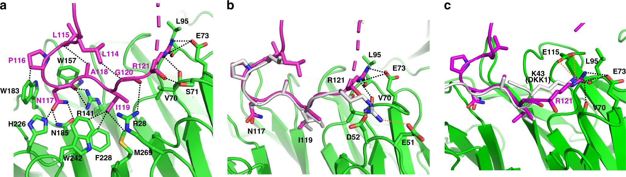 a Key interactions of the SOST loop 2 region with LRP6 E1 (within 4âà ) are shown with dotted lines. Interacting residues are presented as sticks and are labeled black for LRP6 or magenta for SOST. The missing region of SOST (residues 122â127) in this structure is represented with a dashed line. b Comparison of the SOST loop 2 binding site in our structure with that of the LRP6 E1âSOST peptide complex structure (PDB ID: 3SOV) is presented. The SOST âLPNAIGRâ peptide is shown in light gray, and LRP6 E1 from PDB 3SOV is omitted for clarity. The interactions of the NXI motif were found to be conserved in both structures, although the R121-mediated interactions differed. The interactions of R121 in the LRP6 E1-peptide structure are represented with orange dotted lines. c Structural comparison with the LRP6 E1âDKK1 peptide (NSNAIKN) complex (PDB ID: 3SOQ) is shown. The DKK1 peptide is colored in light gray. The interactions of K43 in the LRP6 E1âDKK1 peptide structure are represented in orange dotted lines.