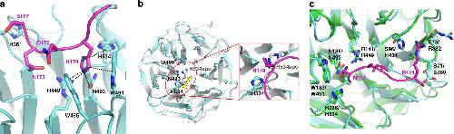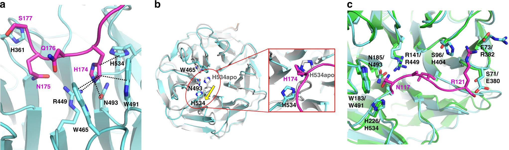 Fig. 3: Interaction of SOST C-tail with LRP6 E2. a The HNQS motif of the SOST C-terminus fits into the binding pocket of the LRP6 E2 β-propeller domain. Interactions of SOST H174 with LRP6 residues are shown with black dotted lines. b The ligand-free state of LRP6 E2 (PDB ID: 3S94; light gray) was aligned to LRP6 E2 (cyan) in our SOST-bound structure. For clarity, SOST was omitted from the overall alignment of LRP6 E2, on the left. Structural changes near W465 and H534 in LRP6 E2 upon SOST binding are shown. H534 of LRP6 moved from the concave center of the β-propeller domain by binding to SOST H174 (colored in magenta in an enlarged box on the right). c The structure of HNQS-bound LRP6 E2 (cyan) was aligned with the structure of loop 2-bound LRP6 E1 (green). The HNQS region is not shown for clarity. Loop 2-interacting residues in LRP6 E1 and corresponding residues in LRP6 E2 are represented as sticks and E2 residues are labeled after the E1 residues.