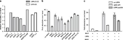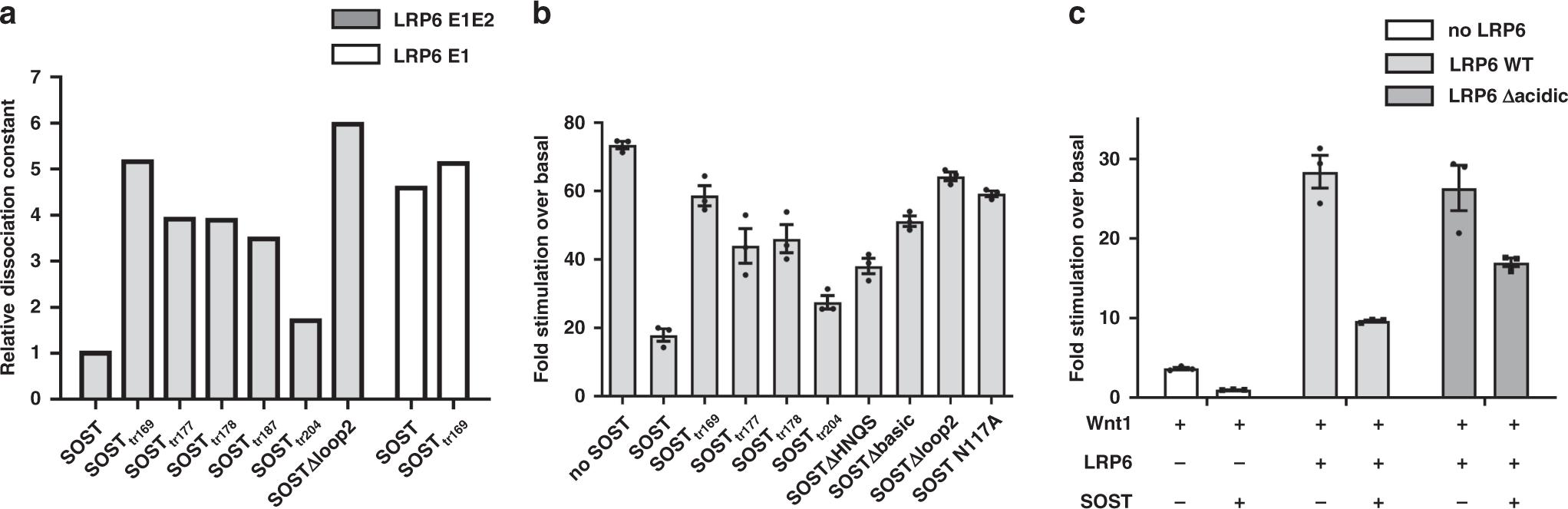 a The affinities of various SOST mutants for LRP6 E1E2 or LRP6 E1 were measured by MST, and the relative KD values from those measurements are shown. The KD value of SOST WT for LRP6 E1E2 was used as a reference. The experimentally determined KD values are provided in Supplementary Table 2. b The inhibitory effects of SOST mutants on Wnt1 signaling were detected by TopFlash assays. Each luciferase signal observed after co-transfecting plasmids encoding Wnt1 and each SOST mutant was normalized to that found with the empty-vector control. c Differences in the inhibitory activities of SOST with WT LRP6 or the LRP6Îacidic mutant in LRP6-knockout HEK293T cells are shown in the bar graph. Data from three independent experiments (nâ=â3) were analyzed and expressed as meanâ±âSEM in b and c.