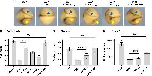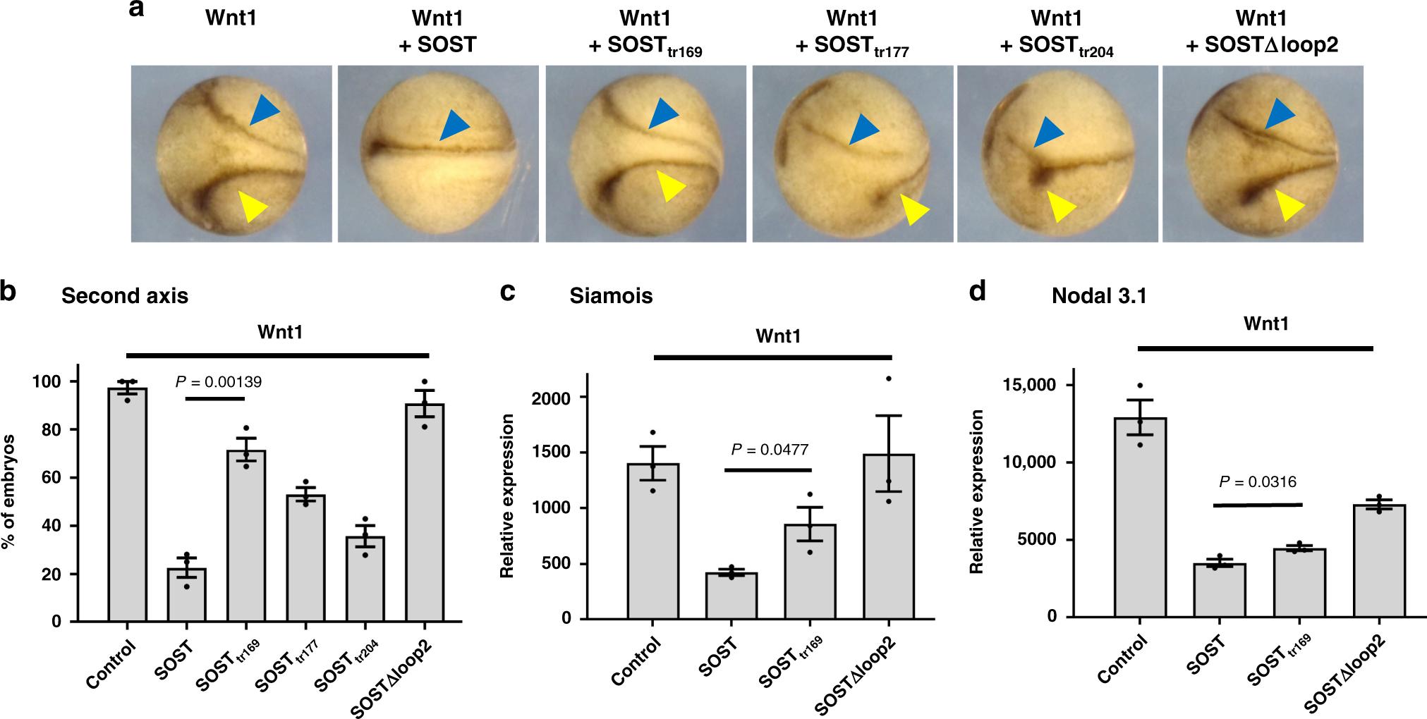 Fig. 5: Assessing the inhibitory effect of SOST on Wnt signaling in Xenopus embryos. a The transverse dark-brown line (blue arrow) indicates the normal position of the axis. The yellow arrow indicates the position of the second ectopic axis. Wnt1 induced formation of the second ectopic axis, and successfully inhibiting Wnt resulted in the formation of a single axis. Embryos at the four-cell stage were co-injected in a ventro-vegetal blastomere with 30âpg Wnt1 mRNA (nâ=â104), 25âpg WT SOST mRNA (nâ=â106), 25âpg SOSTtr169 mRNA (nâ=â98), 25 pg SOSTtr177 mRNA (n = 119), 25 pg SOSTtr204 mRNA (n = 104), and 25âpg SOSTâloop2 mRNA (nâ=â96) (n number of embryos). b The percentage of embryos with a second axis. The error bars represent the standard error of the mean (SEM) from three independent experiments (nâ=â3) and p value by two-tailed t-test is indicated. The number of injected embryos is described in a. c, d Real-time qPCR analyses of the expression of genes directly targeted by Wnt1, namely siamois (c) and nodal 3.1 (d) from animal cap explants isolated at stage 8 and grown to stage 11. The error bars represent SEMs from three independent experiments (nâ=â3) and p values by two-tailed t-test are indicated.