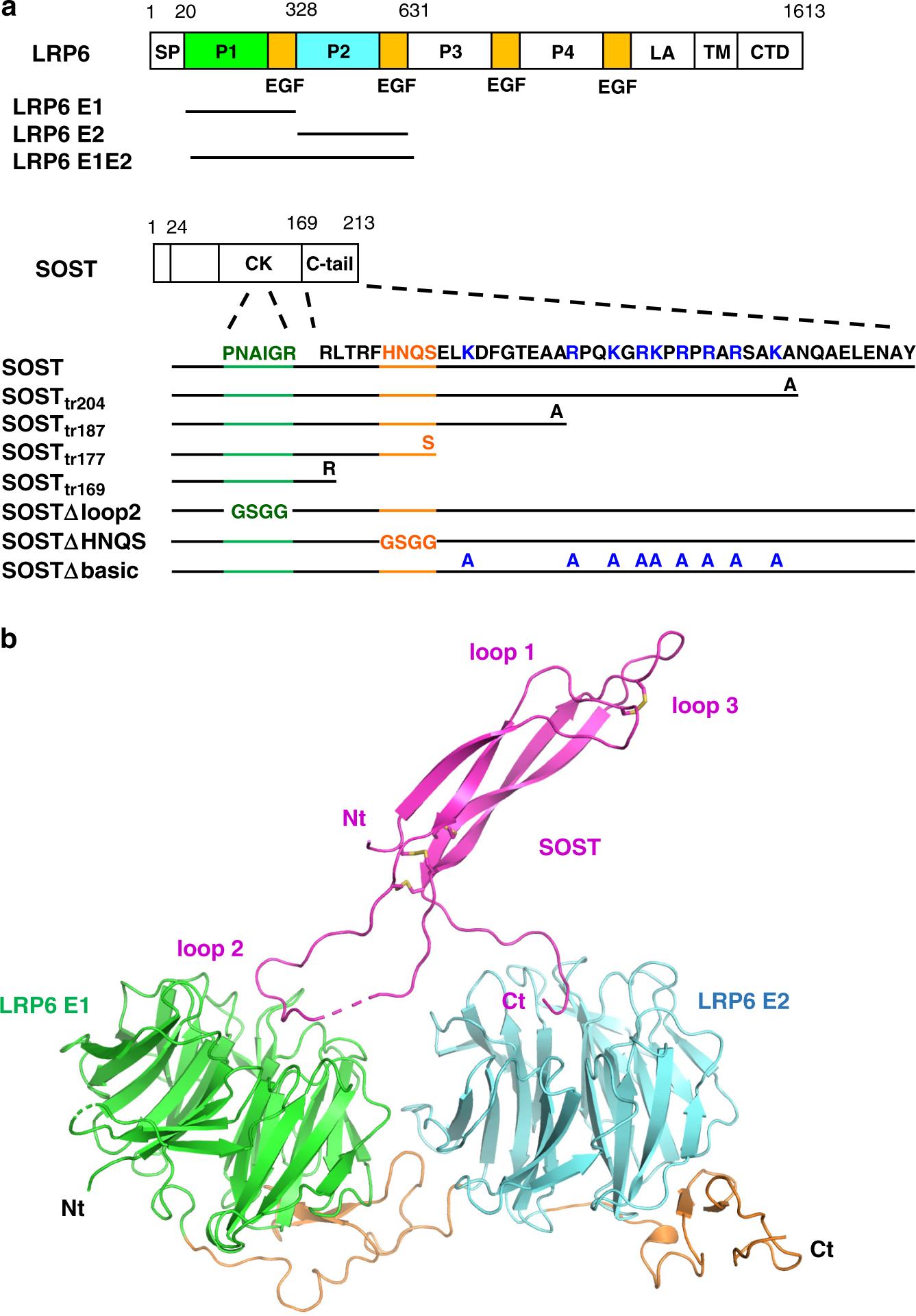 Fig. 1: Construct design and the crystal structure of the LRP6 E1E2âSOSTtr177 complex.